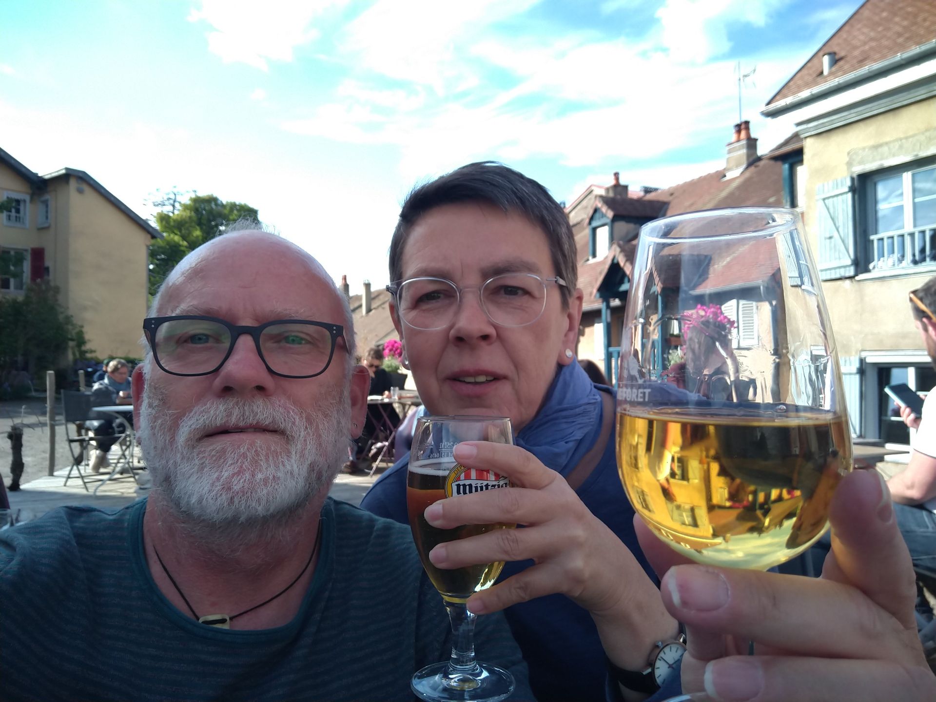 Gegen 15 Uhr sind wir in Arbois, checken ein und laufen gleich wieder los. Nach vielen Stunden im Auto braucht es das. Wir erkennen vieles wieder. Viel hat sich nicht geändert. Wir reservieren einen Tisch im Restaurant "Le Petit Jurasien", gegenüber des Hotels. "Unser Besonderes Restaurant" gibt es nicht mehr. Irgendwo im Örtchen genehmigen wir uns einen Aperitif an der Cuisance. Ich nehme einen Macvin - ähnlich einem Sherry, aber aus hiesigen Trauben.