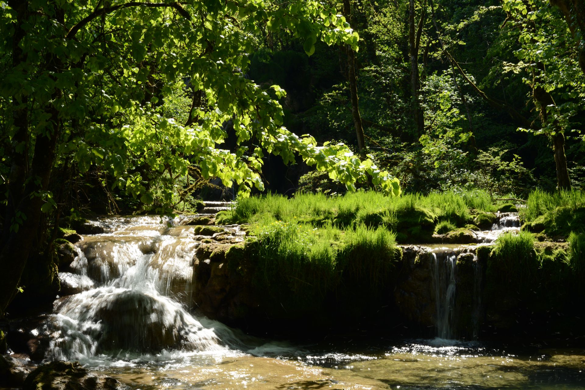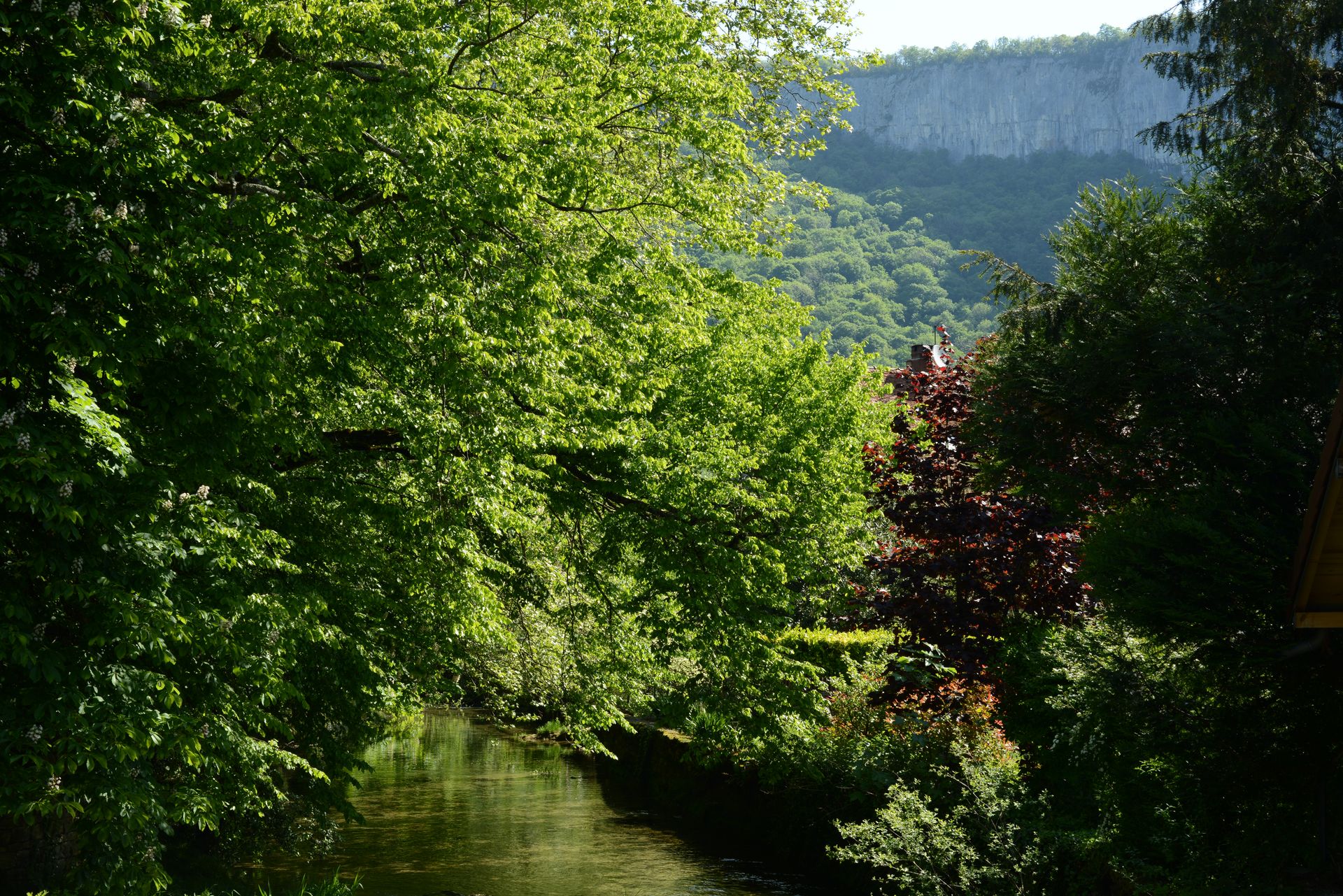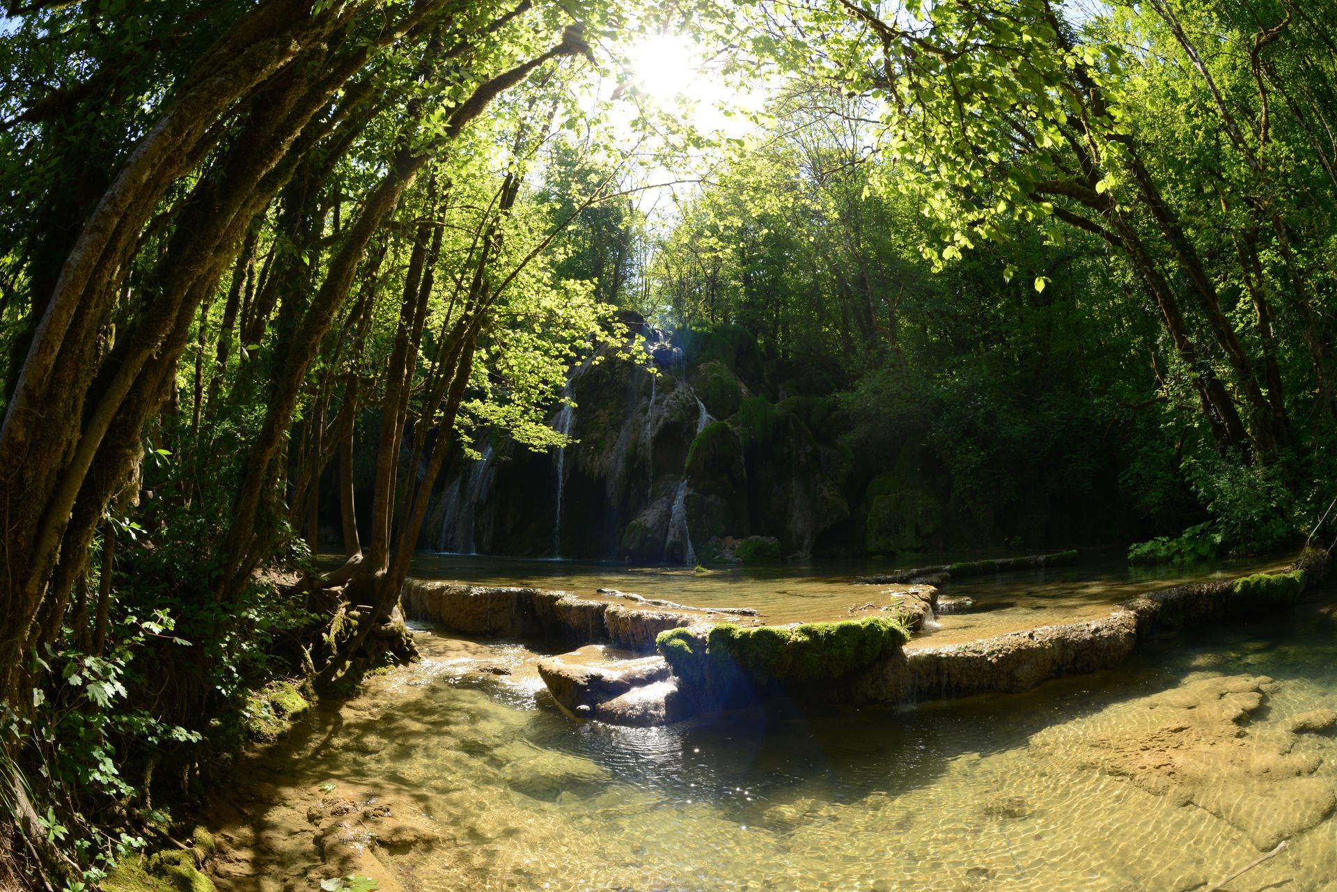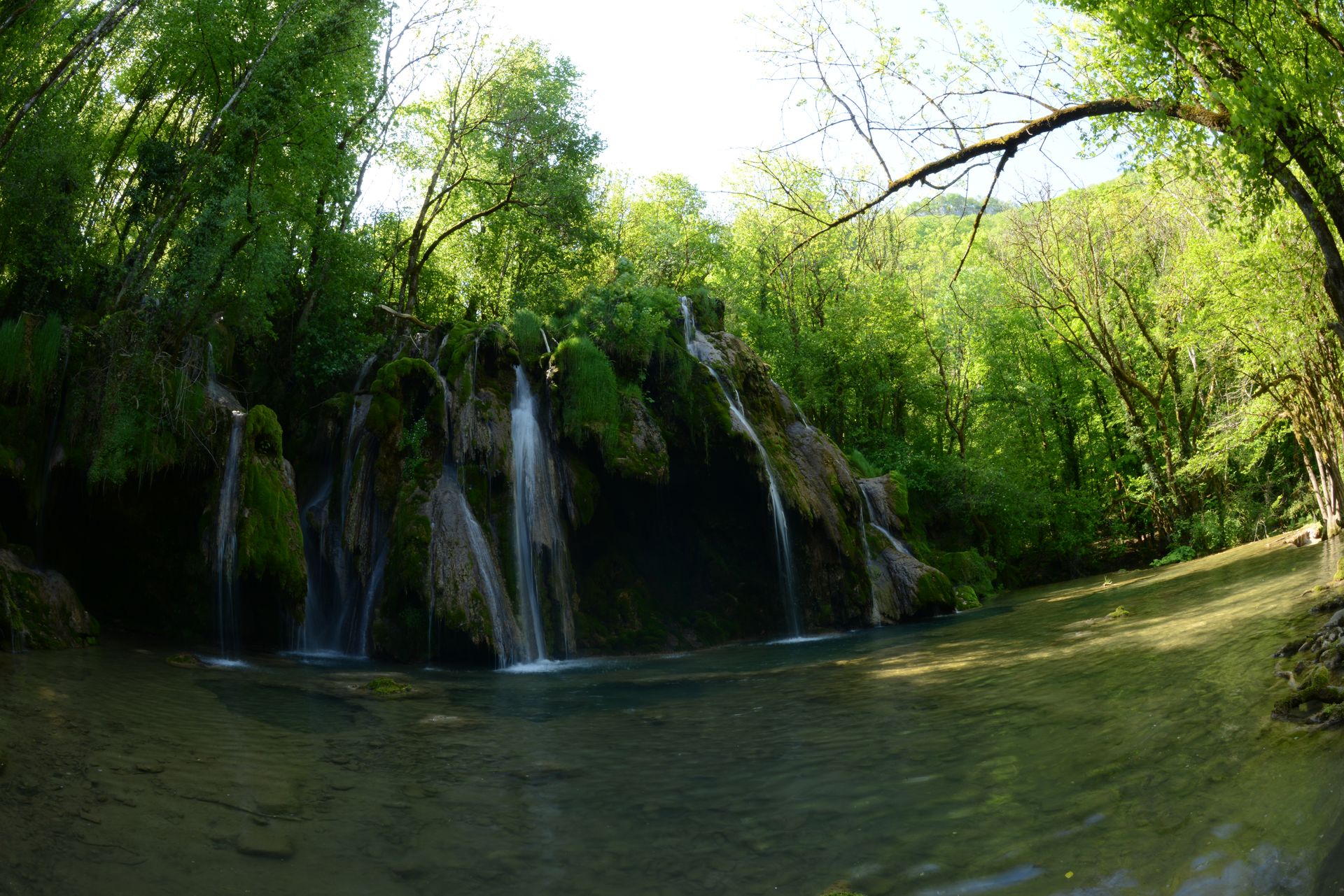 Danach fahren wir auf einer grottenschlechten Straße, durch eine wunderschöne Ebene, nach Les Planches-près-Arbois. Ein ganz kleines Dorf mit einem kurzen Spazierweg zu Tuffstein-Terrassen/Wasserfällen. Traumhaft - ein paar Grad wärmer und man meint, man sei in der Südsee. Türkisfarbenes Wasser, ein Urwald und immer wieder über Steine plätscherndes Wasser.