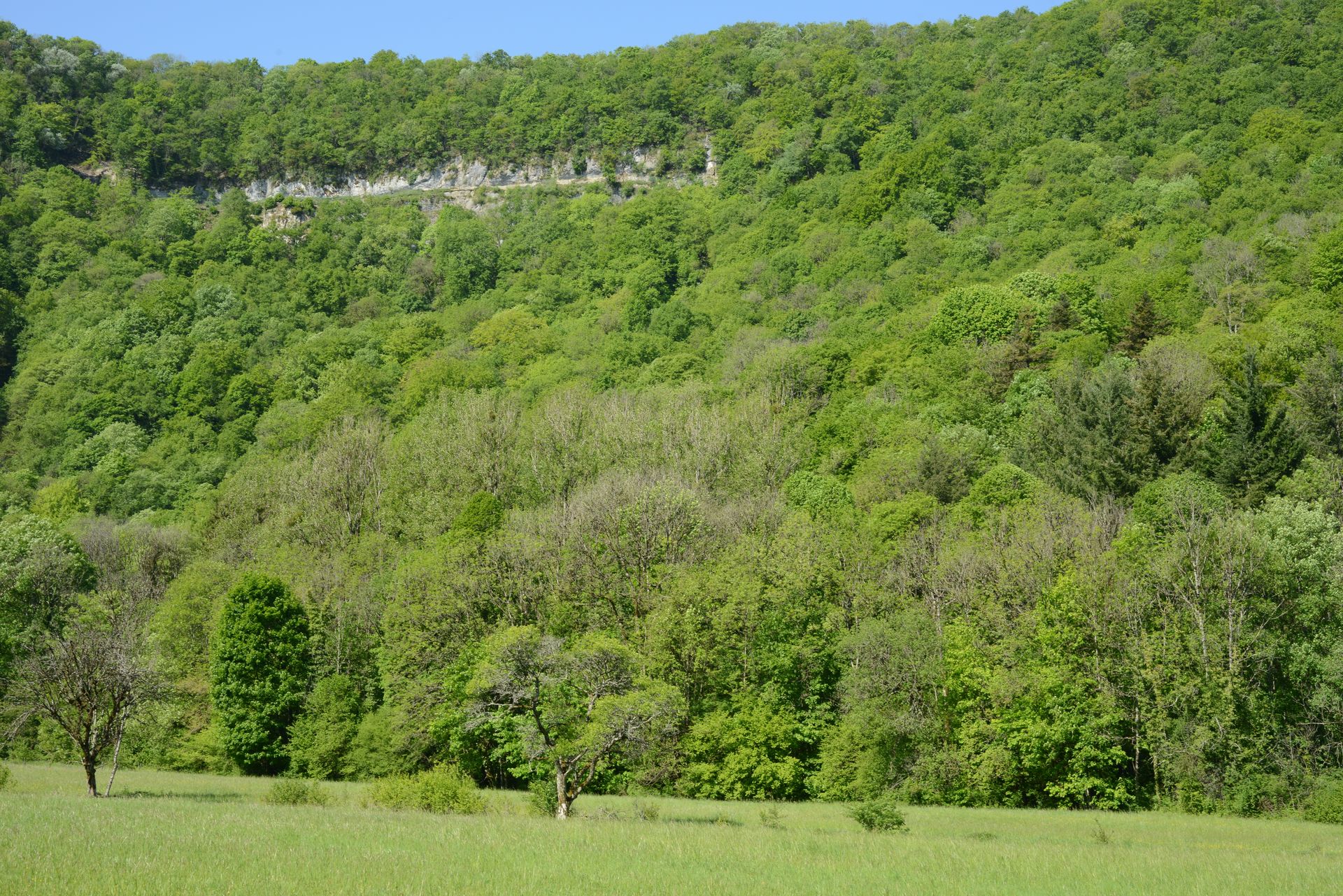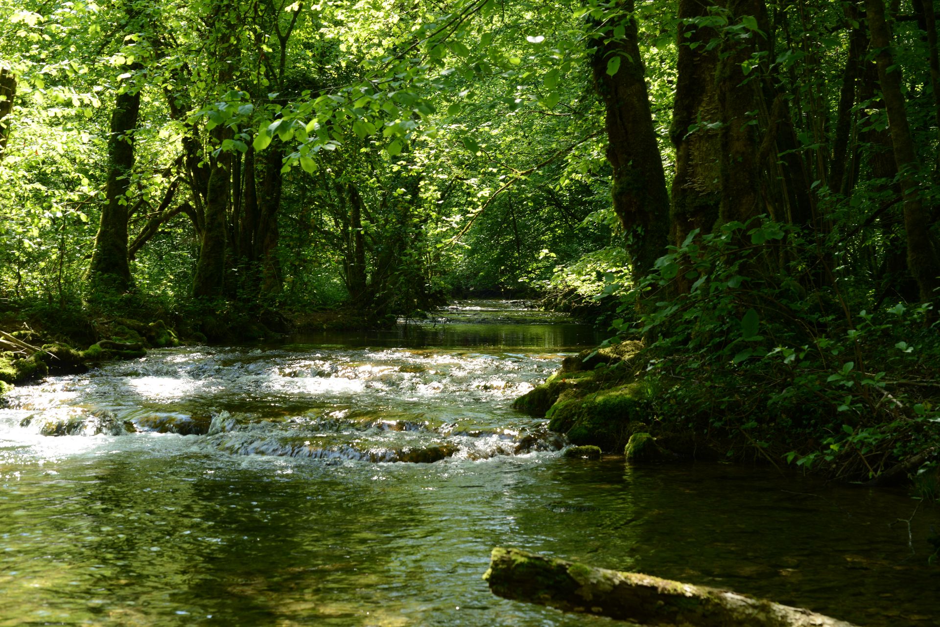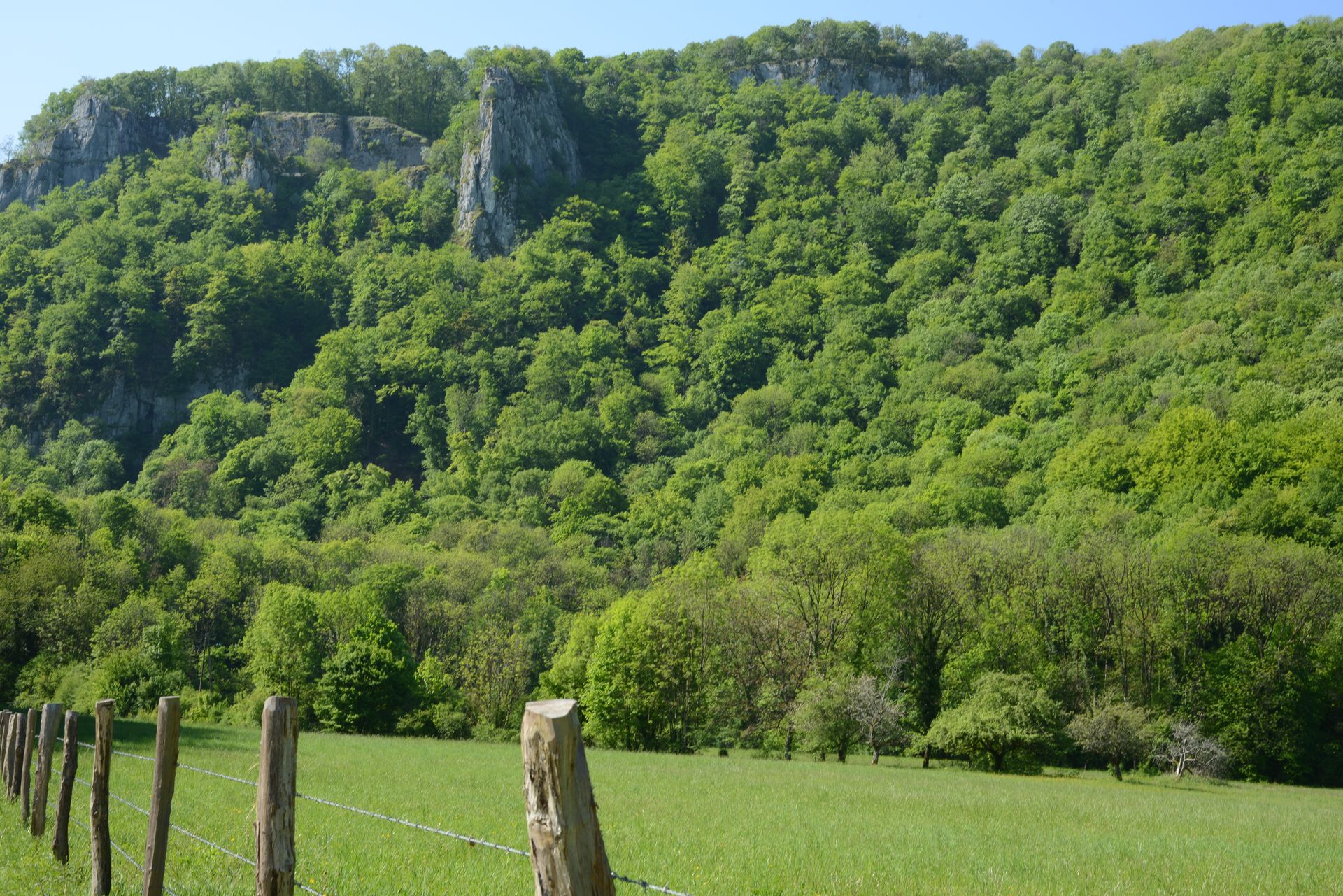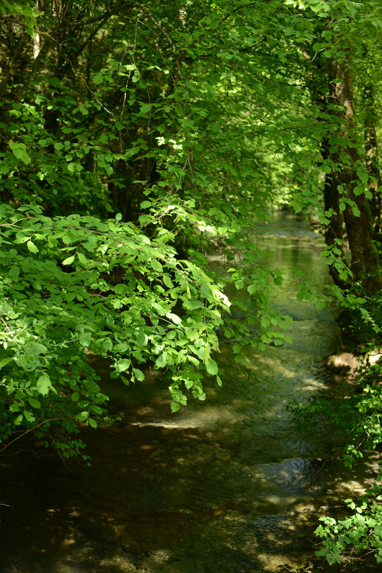 Danach fahren wir auf einer grottenschlechten Straße, durch eine wunderschöne Ebene, nach Les Planches-près-Arbois. Ein ganz kleines Dorf mit einem kurzen Spazierweg zu Tuffstein-Terrassen/Wasserfällen. Traumhaft - ein paar Grad wärmer und man meint, man sei in der Südsee. Türkisfarbenes Wasser, ein Urwald und immer wieder über Steine plätscherndes Wasser.