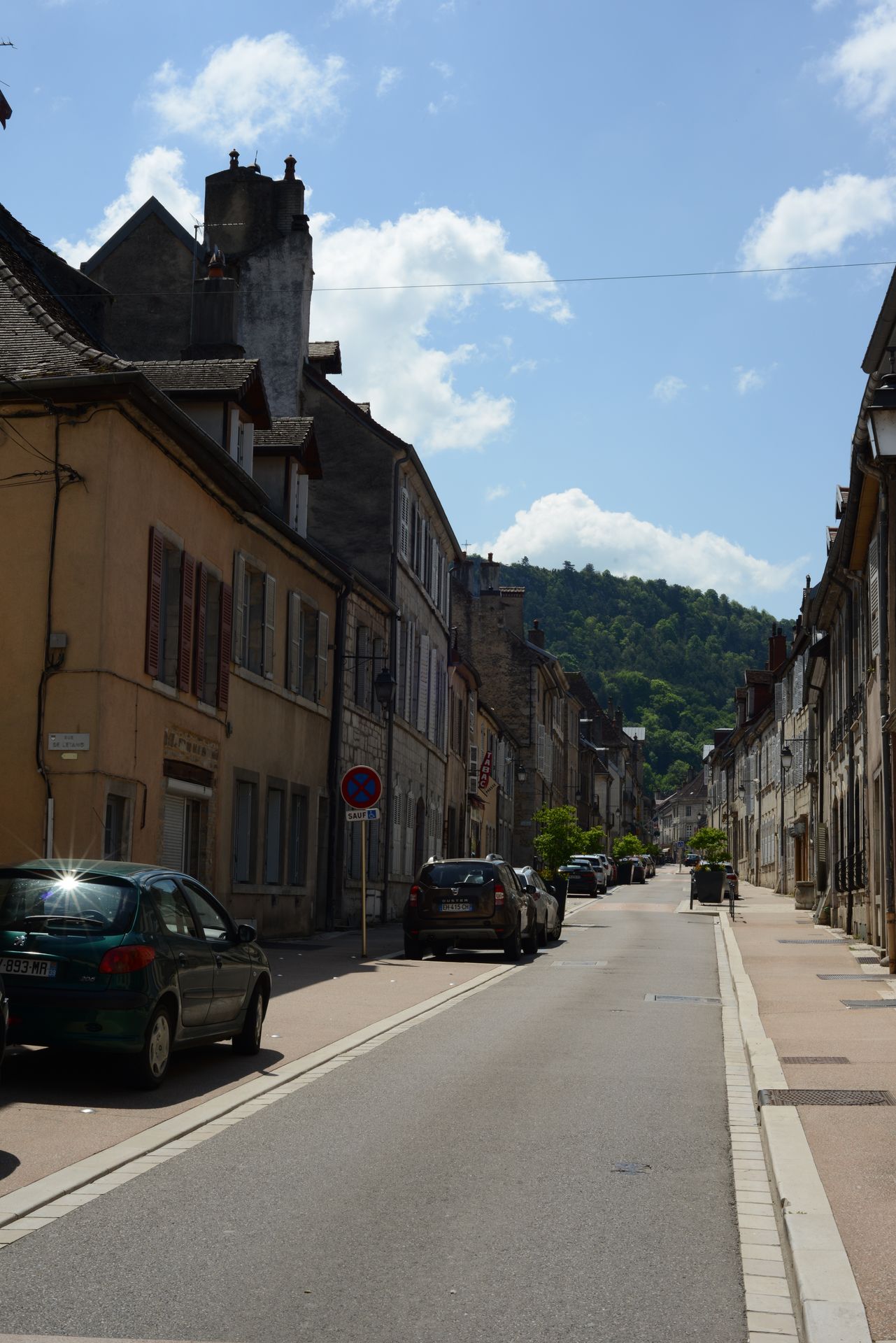 Eigentlich dachten wir im Winzerdorf Pupillin einen Halt machen zu müßen, aber außer den zahlreichen Vignerons, fällt uns nichts ins Auge warum wir das tun sollten. Also direkt nach Poligny, wo wir ein bißchen durch die Gassen schlendern und anschließend auf dem Dorfplatz einen Salat zu uns zu nehmen. Eigentlich sind wir ja keine Mittagesser, aber erstens ist das Frühstück hier nicht lange anhaltend und das Abendessen gibt es NIE vor 19:00.