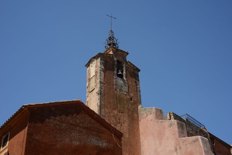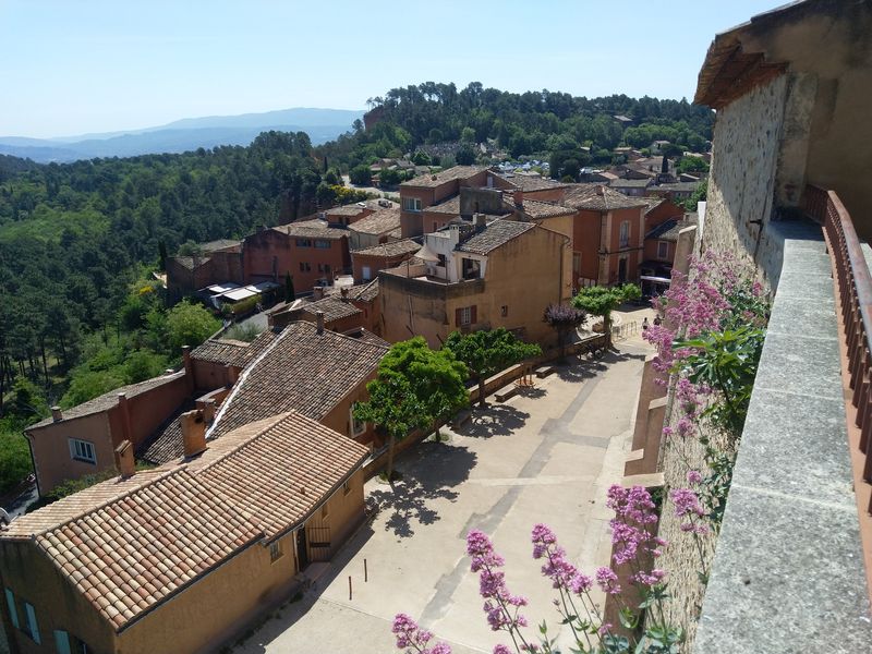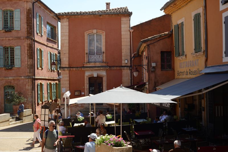 Danach laufen wir über den Markt der hier heute ebenfalls stattfindet. Es gibt einen tollen Messerstand und Einen mit schönen Gewürzen. Der Rest ist eher was für die Touristen. Wir laufen durch das Dorf hinauf zum Belvedere von wo man schön auf die Ockerfelsen schauen kann. Auf dem zentralen Platz gönnen wir uns einen Café. Gott sei Dank hat die Countryband aufgehört zu spielen. Passt einfach nicht so recht hierher; ist aber vielleicht den vielen amerikanischen Touristen geschuldet. Am Markt holen wir uns ein paar Frühlingsröllchen. Das gibt es immer auf französischen Märkten und die sind meist sehr lecker. Leider kommt es durch einen Kommunikatinsfehler dazu, dass wir 6 Stück mit Salat in einer Bowl bekommen. Also eigentlich ein komplettes Muttagessen. War so nicht geplant.