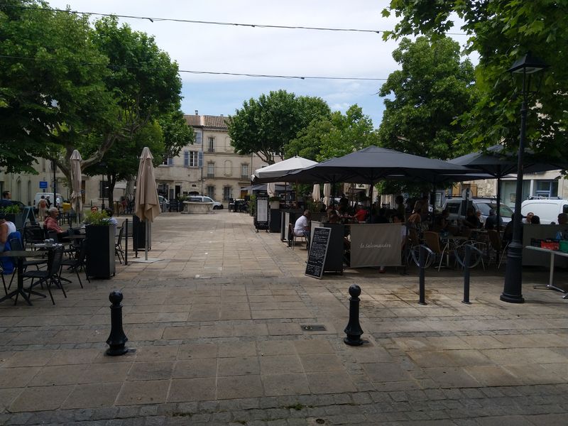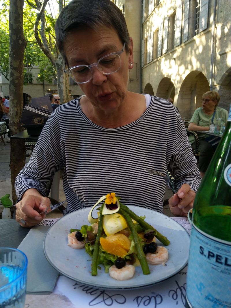 Weiter nach Uzès dauert es nur noch etwa 45 Minuten. Wir finden einen kostenlosen Parkplatz etwa 10 Minuten zu Fuß von unserer Wohnung "La Boheme Place aux Herbes" entfernt. Den deponierten Schlüssel bekommen wir problemlos, im 2. Stock ist unsere kleine Wohnung. Wir sind total begeistert. Das Wohnzimmer geht zum Markplatz, das Schlafzimmer nach hinten in eine ruhige Gasse. Alles ist schön eingerichtet, zweckmäßig und es gibt nix zu meckern. Super! Wir gehen für Frühstücke einkaufen und drehen dann noch eine Runde um die Restaurantlage zu sondieren. Es gibt so viele, dass wir überfordert sind. Nach einem Glas Champagner (das hatte ich mir vorgenommen) entscheiden wir uns für das "Les Amis". Es gibt einen Spargel-Crevetten-Salat und danach ein Terriaki-Huhn bzw. ein Iberico-Schwein. Schön auf diesem belebten Platz zu sitzen und sich alles anzuschauen.
