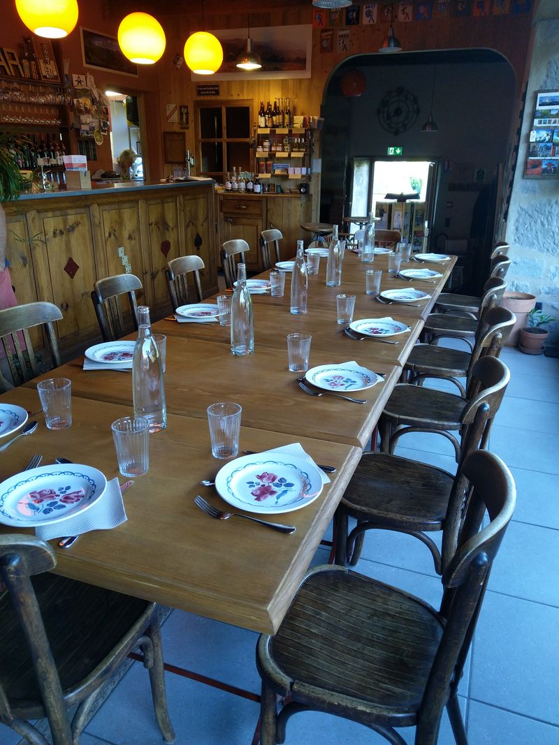 Virginie erklärt uns, dass sie versucht das Abendessen (alle sitzen zusammen an einem großen Tisch) um 19:30 auf den Tisch zu bringen, es könnte aber auch mal 19:45 werden. Ja, bis die Vorspeise auf dem Tisch steht ist es 20:15 und wir haben Hunger! Es gibt vier Gänge, alles ist sehr lecker. Das Problem ist nur, dass wir mit 12 Franzosen am Tisch sitzen und alle nur französisch sprechen. Und das ist echt anstrengend, vor allem wenn man Hunger hat und nicht mehr so richtig denken kann. Aber Thomas schlägt sich wacker und nach 2 (nur mässig eingeschenkten) Gläsern Rotwein klappt es einigermaßen.