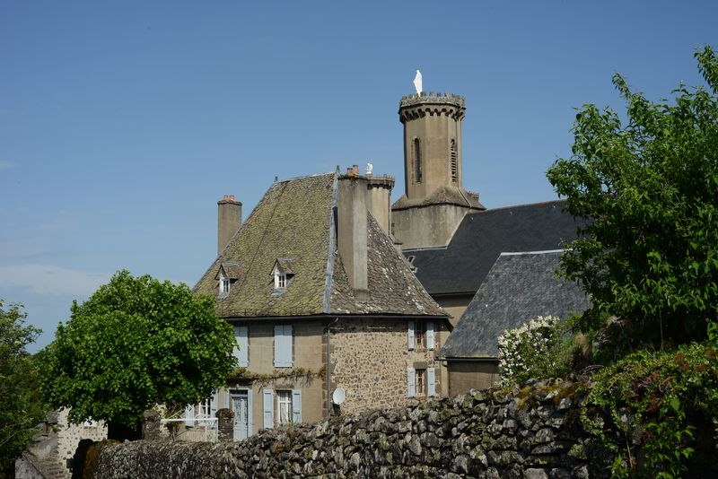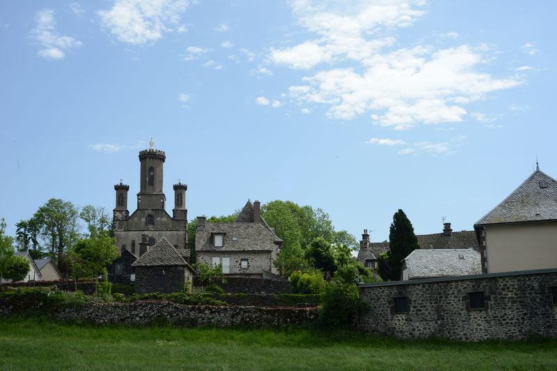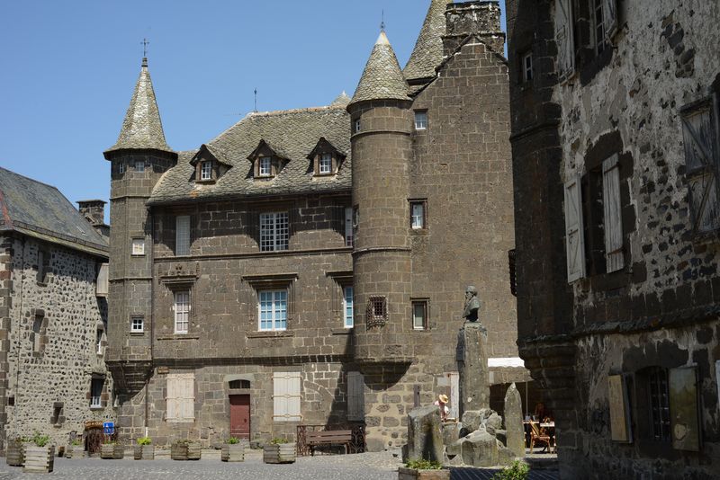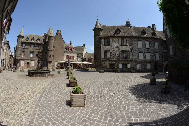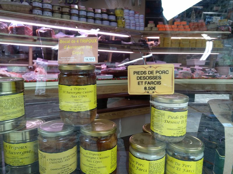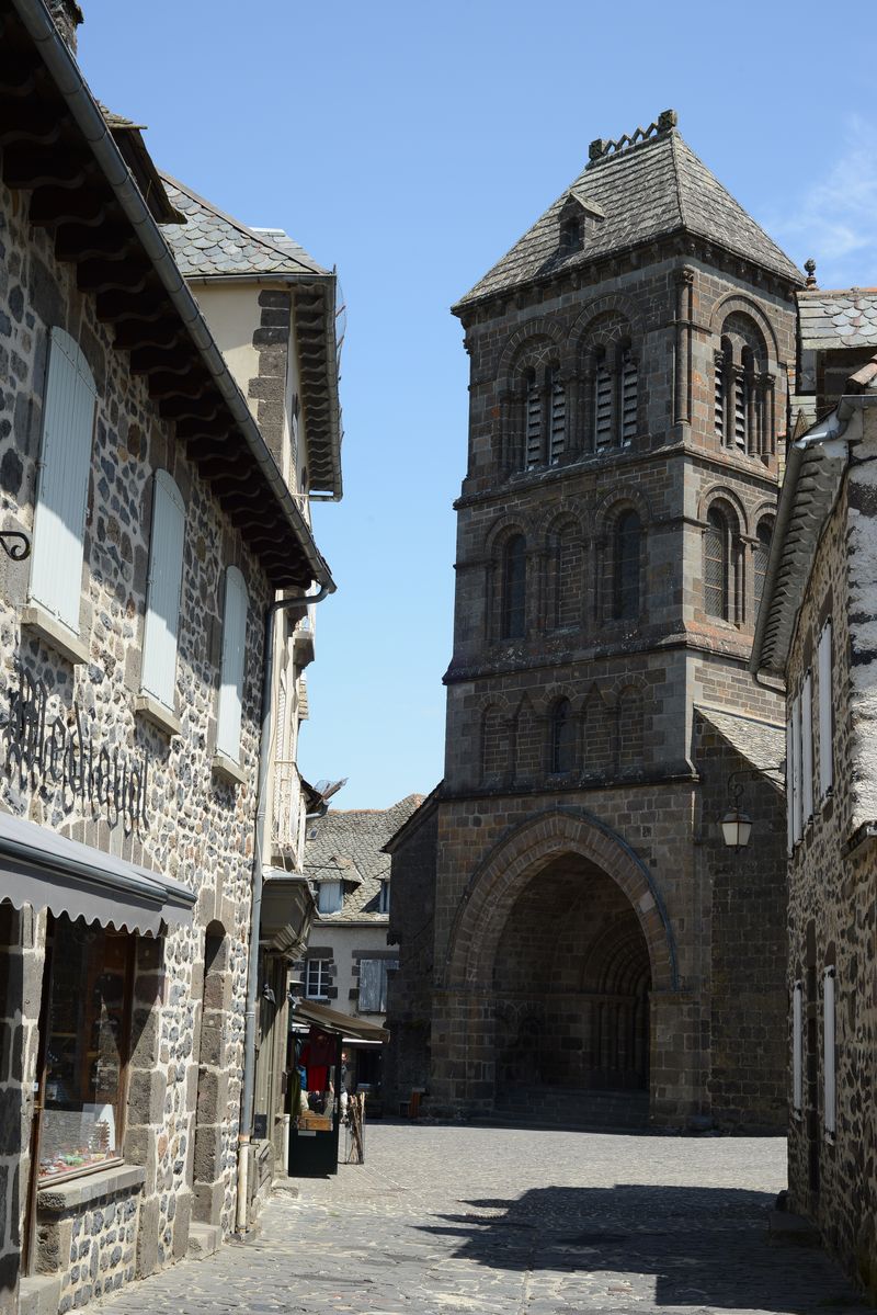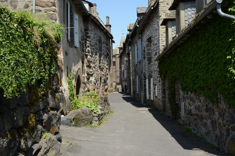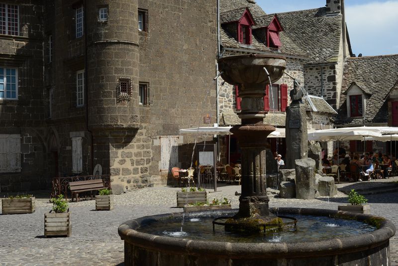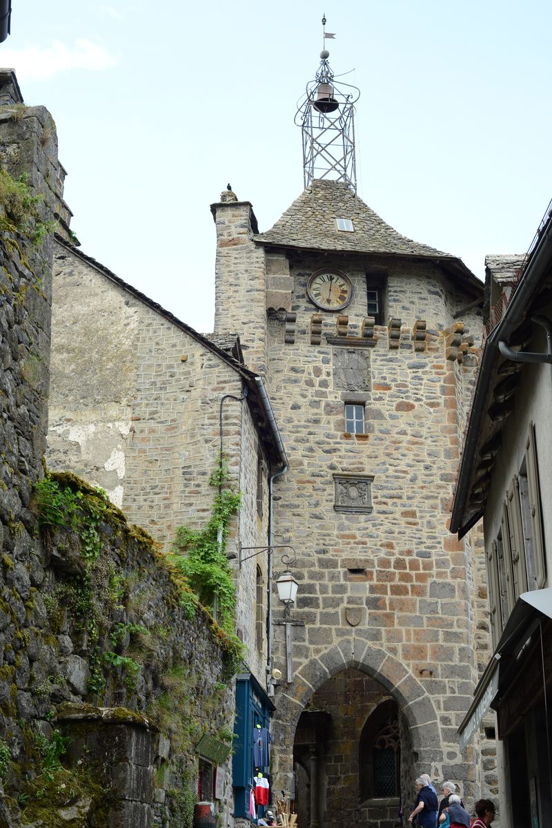 In Salers selbst sind die meisten toll restaurierten Häuser aus dem 17.Jhdt.. Viele Türmchen, eine Kirche mit einem imposanten Eingangsportal und viele massive Türeinfassungen gibt es zu bestaunen. Es gibt doch tatsächlich ein paar Tropfen Regen. Deswegen gönnen wir uns einen Café unter einem Vordach sitzend.