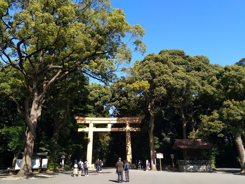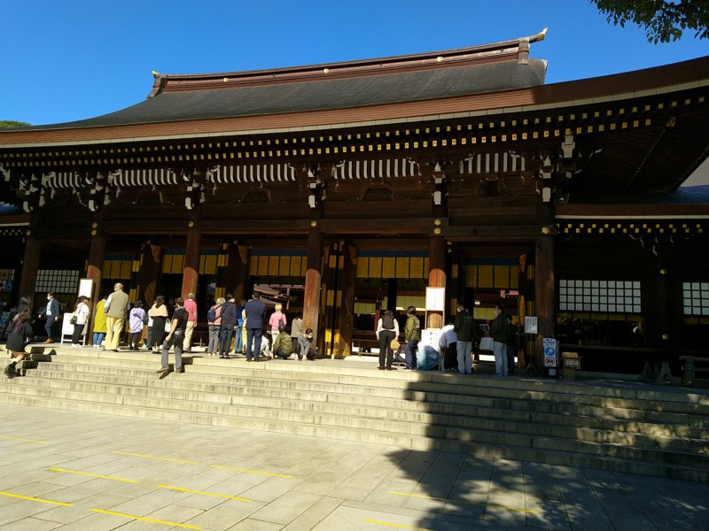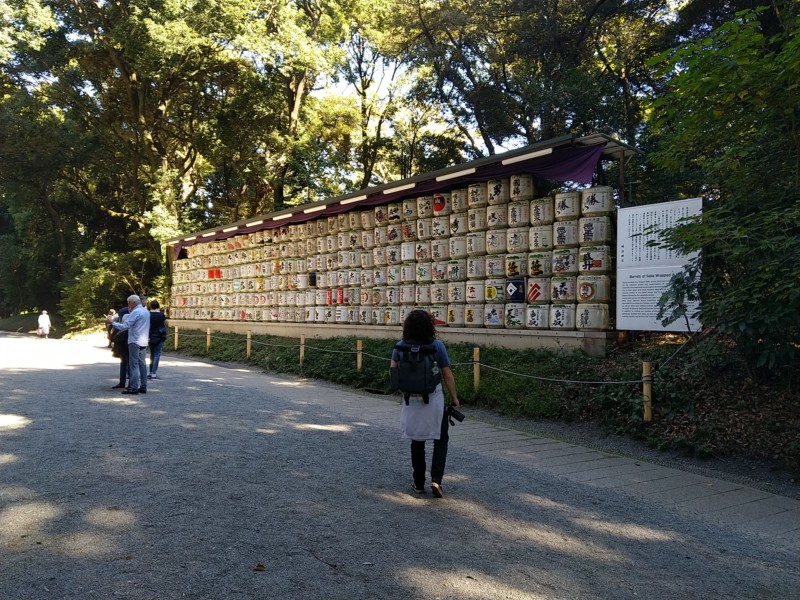 Mit der U-Bahn fahren wir in den Meiji-Park im Westen und schauen uns einen Shintoshrein an, der in einem sehr schönen Park liegt. Die U-Bahn ist ganz schön voll - meinen wir - Keishi zeigt uns Videos von Schuppsern. Leuten die zur Rushhour Fahrgäste in die Waggons quetschen. Unglaublich!