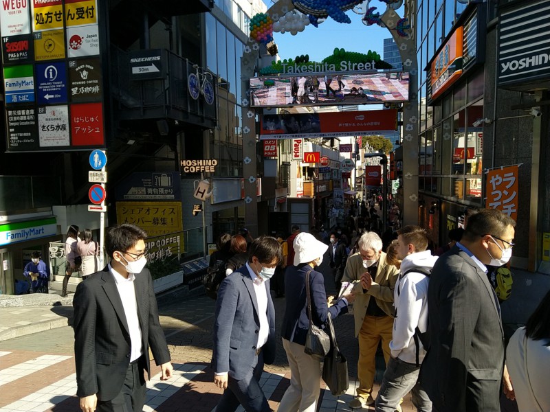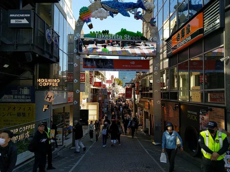 Zur nächsten Attraktion fahren wir diesmal mit der Bahn zu einer Kreuzung im Stadtteil Shibuja. Diese ist weltberühmt, weil dort mehrere Strassen zusammenkommen und alle Autos gleichzeitig rot haben und dadurch die Kreuzung für die Fussgänger komplett frei ist. Ein ziemliches Gewusel. Leider sind die Aussichtspunkte wegen Halloween gesperrt oder zugehängt - aus Sicherheitsgründen. Da muss ja echt was los sein!