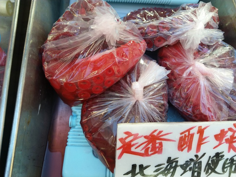 Natürlich finden wir ein nettes kleines Restaurant. Es gibt grünen Tee umsonst und eine verständliche Karte. Elke nimmt katsu-don - Reis mit paniertem Fleisch und einer Soße aus Ei. Ich habe Reis mit Garnele, Oktupus, eine grosse, weisse Muschel, Feisch und Kürbis. Dazu gab es jeweils etwas Gemüse und eine Misosuppe. Alles sehr lecker.