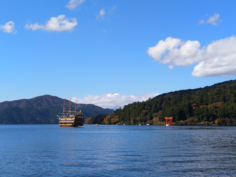 Weiter geht es dann nach Westen zum Ashi-See. Hier brummt der Bär. Einerseits ist es supertolles Wetter und über dem See thront der Fuji (eigentlich DIE Fuji, weil Fuji weiblich ist). Wir haben ihn während der Herfahrt immer Mal wieder gesehen, aber hier über dem See - wahnsinnig schön. In Hakone steigen wir in ein Schiff und fahren über den See ans andere Ufer. Leider ist es ziemlich voll und Plätze an der Reling Magelware. Dir Youngsters müssen sich dauernd selbst fotografieren und versperren die Aussicht.
