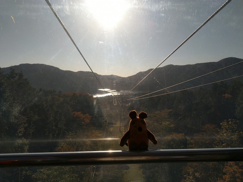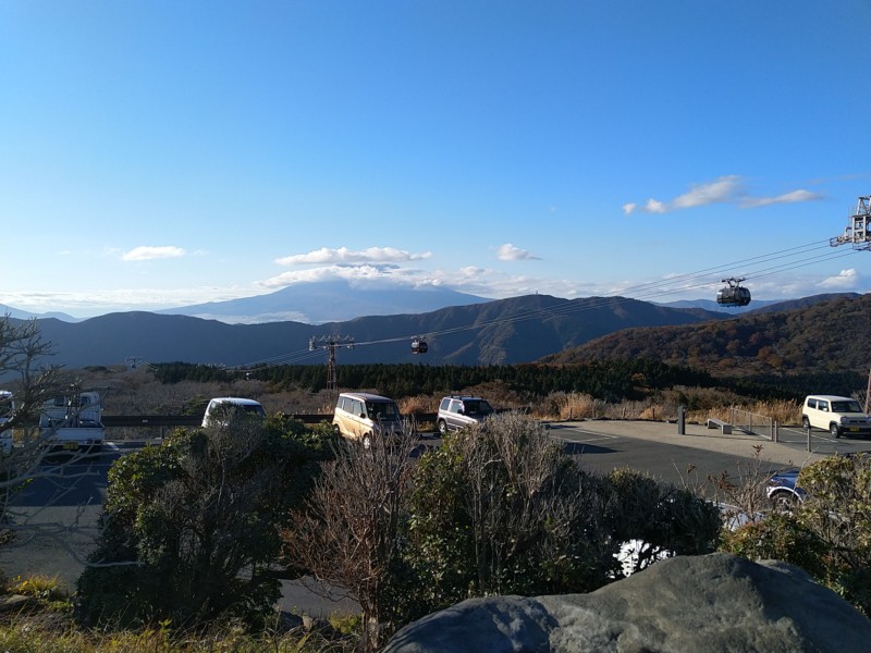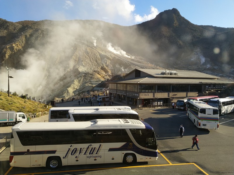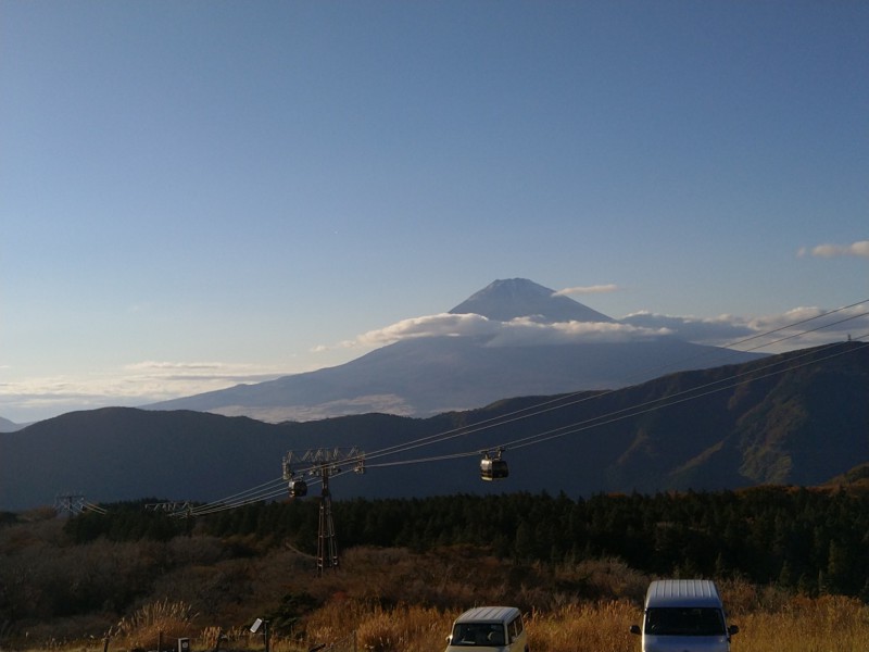 Auf der anderen Seite angekommen steigen wir in eine Seilbahn die uns auf 1044m bringt. Dort kann man zwar auf den kommerziellen Abbau von Schwefel schauen, aber nicht auf den Fuji. Die spinnen die Römer. Von einem Parkplatz aus geht dann doch noch ein schneller Blick.