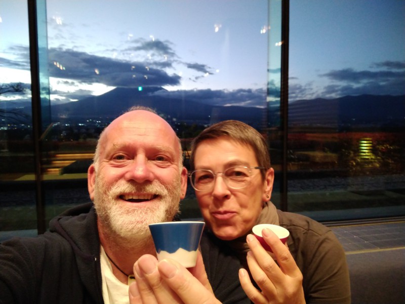 Im Hotel, über einem Outletcenter, beziehen wir unsere Zimmer. Wir hatten das Hotel schon zu Hause gegoogelt und fanden es sehr schön. Zimmer mit Blick auf den Fuji. Alle Zimmer unserer Gruppe gehen auf die andere Seite - zum Parkhaus des Outlets. Klasse! Wir nehmen den Likör und gehen in die Lobby und schauen uns den Fuji hinter Glas an. Das ist doch tatsächlich der einzige Platz im Hotel wo man auf den Fuji schauen kann. Wie sind denn die Japaner drauf? Du fährst auf über 1000m oder bist in einem tollen Hotel und kannst dir die Hauptattraktion nicht ansehen!