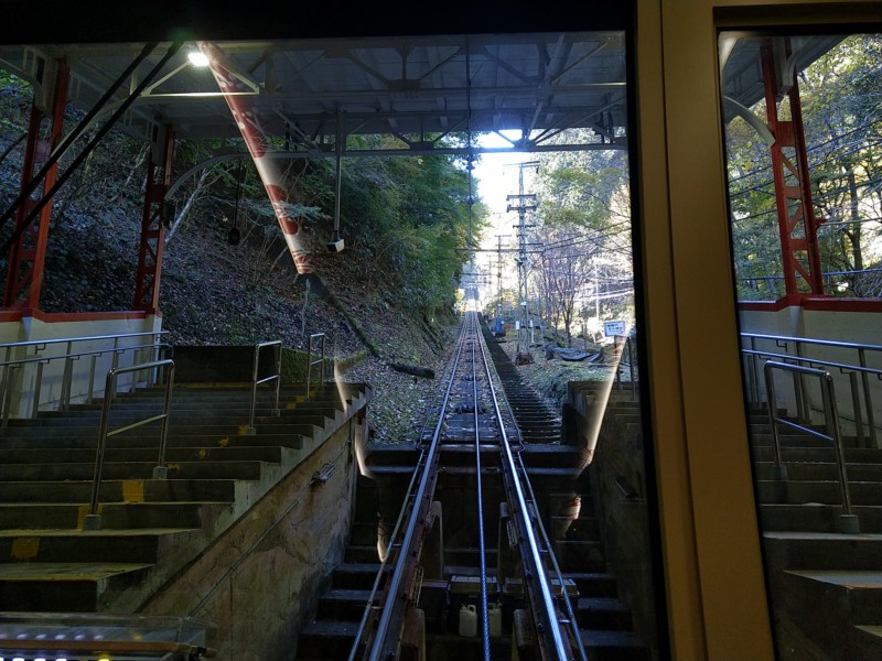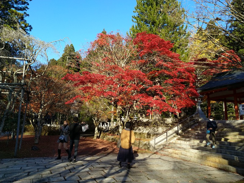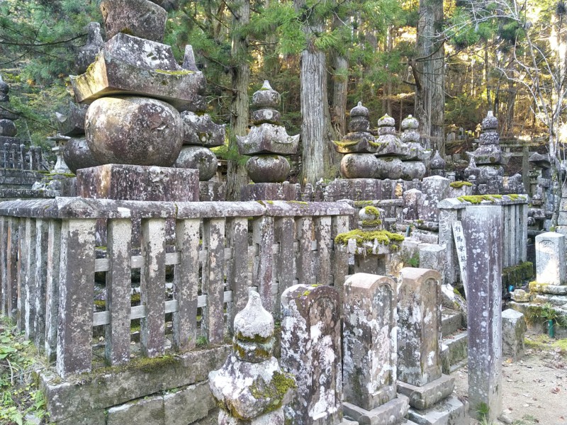Heute fahren wir, wieder mit öffentlichen Verkehrsmitteln, zur Klosterstadt Koya-san. Das liegt ein ganzes Stück südlich von Osaka. Zuerst fahren wir mit dem Zug, der für Sonntag ganz schön voll ist. Dann steigen wir in eine Zahnradbahn, die uns von 500 auf 800 Meter bringt, und dann in einen Bus. Hier oben ist es um einiges kälter, im Schatten fast nicht auszuhalten. Wir können unser Hauptgepäck in der Herberge begrüßen. Wie schön. Das war das letzte Mal mit Handgepäck! Ist eigentlich nicht schlimm, nur etwas lästig.