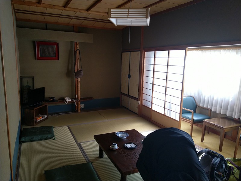 In der Herberge zurück ziehe ich den Kimono an und gehe ins Onzen, das Gemeinschaftsbad. Natürlich nach Geschlechtern getrennt. Dort wäscht man sich und setzt sich dann in ein heißes Bad. Nicht unangenehm 😁.
