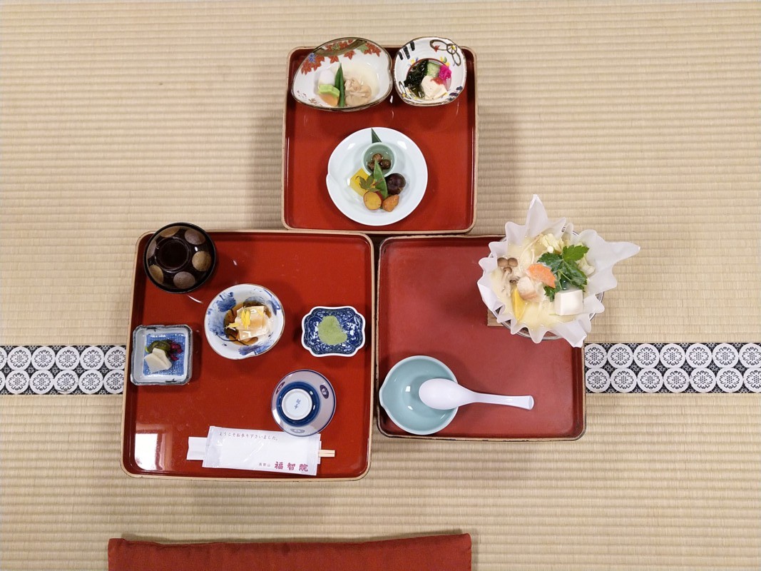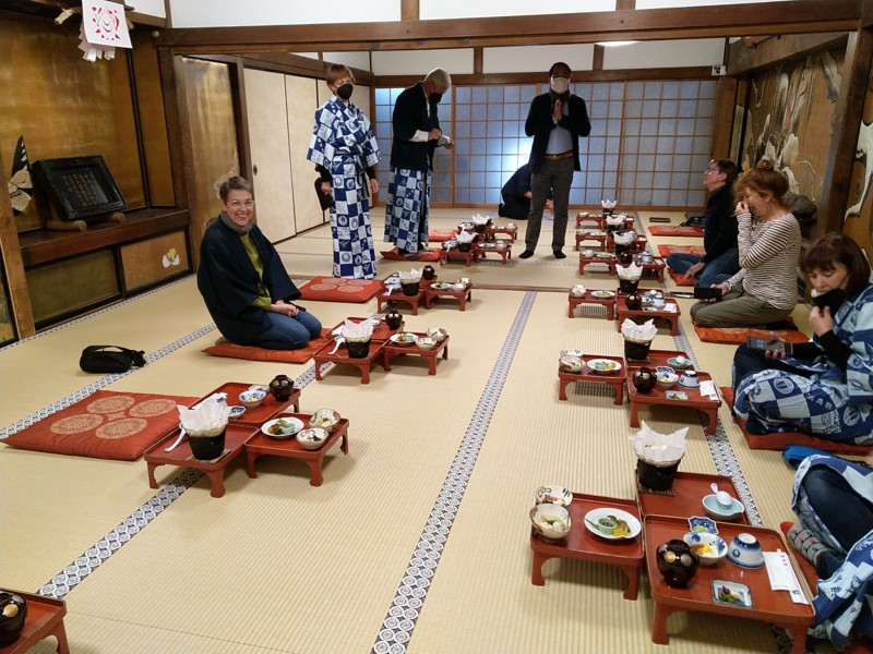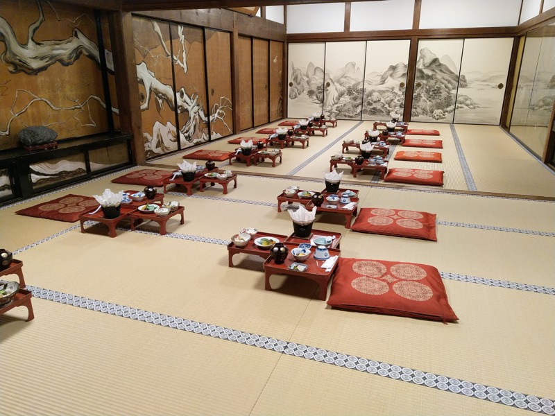 Das Abendessen nehmen wir gemeinsam im Schneidersitz ein. Auweia. Das ist für alle kein Vergnügen. Das Essen ist auch nicht für jeden das Optimum. Es ist rein vegetarisch und es gibt viel Tofu - in allen Aggregatzuständen. Geröstet, frittiert und weiss der Teufel was noch. Das muss man schon mögen. Dazu gibt es natürlich viel Gemüse, aber auch da in oft ungewöhnlicher Zubereitung. Insgesamt war es eine tolle Erfahrung, weil äußerst ungewöhnlich. Kurz kämpfen wir noch mit der Klimaanlage, die nicht heizen will. Es ist recht frisch geworden und die Herberge insgesamt zugig.