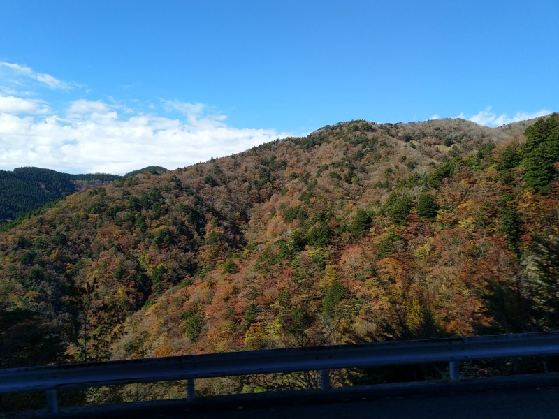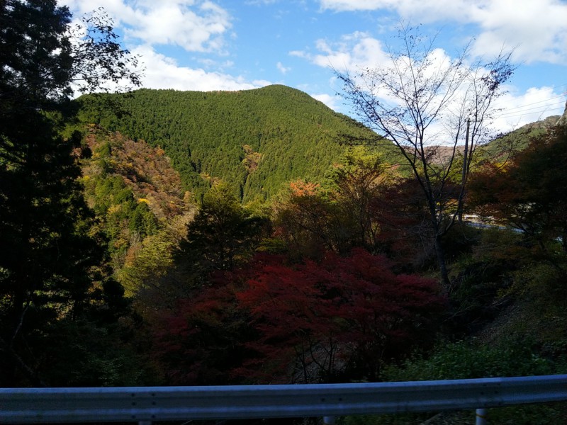 Die Fahrt nach Hosshinmon-oji dauert etwa 3 Stunden wo wir eine Wanderung auf dem Pilgerweg Kumano Kodo machen werden. Die Landschaft durch die wir fahren ist atemberaubend schön; tiefe Täler mit reissenden Bächen und überall Herbstlaub!