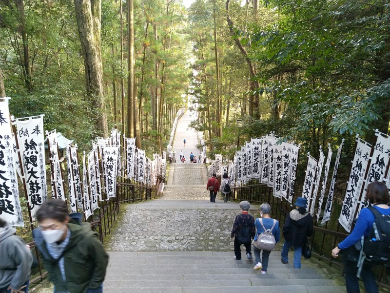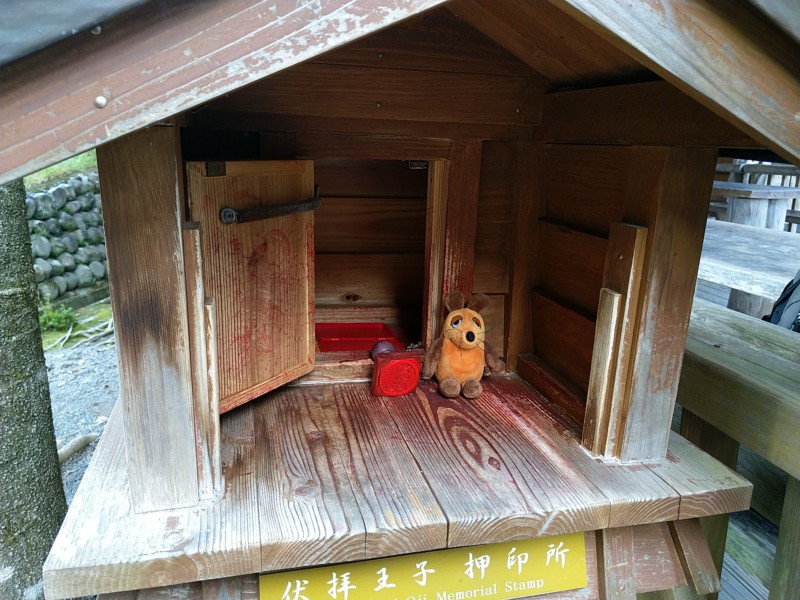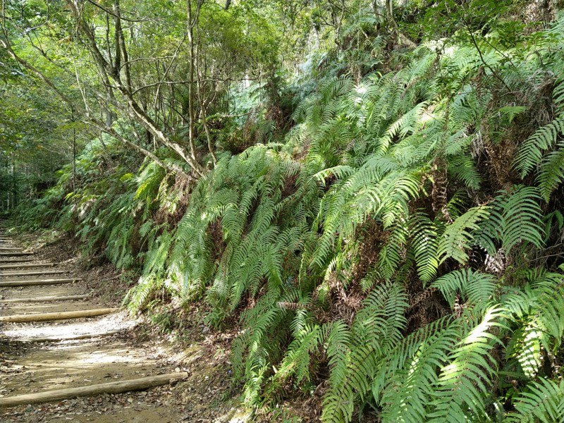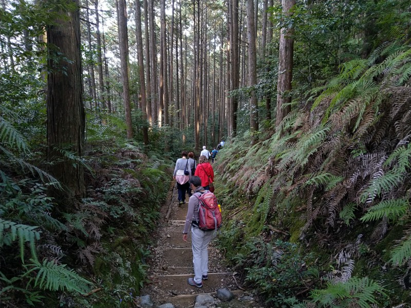 Der Weg ist echt klasse. Er führt in den Wald hinein. Es gibt hohe Kiefern und jede Menge Farne. Toll! Der Untergrund ist nicht schwierig und die Steigungen bzw. Gefälle überschaubar. Am Ende erwartet uns ein Shintoschrein - Kumano Hongu Taisha mit der heiligen dreibeinigen Krähe. On Top noch ein Tor von 33m Höhe und den 6. Stempel im Heftchen.