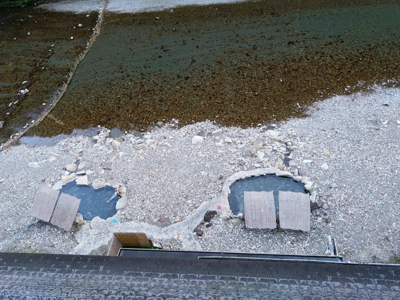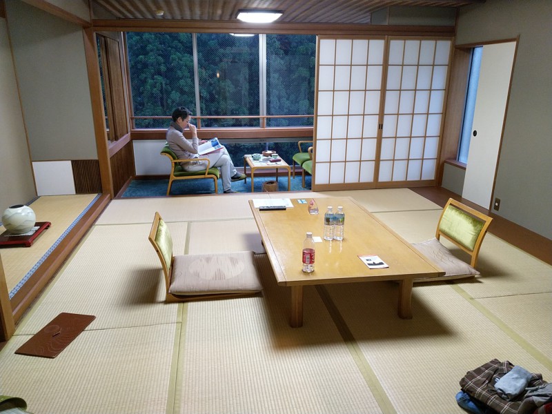 Keine 10 Minuten später sind wir im Hotel. Das Zimmer im 6.Stock hat einen Blick auf den Kumanofluss und ist meines Erachtens stylisch eingerichtet. Dummerweise gibt es auch hier Futons die wieder während des Abendessens aufgebaut werden. Wir kochen uns einen Tee/Instantkaffee und genießen ihn in unserem Wintergarten sitzend mit Blick auf den Fluß und die untergehende Sonne.
