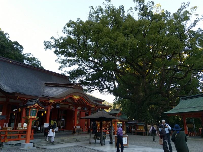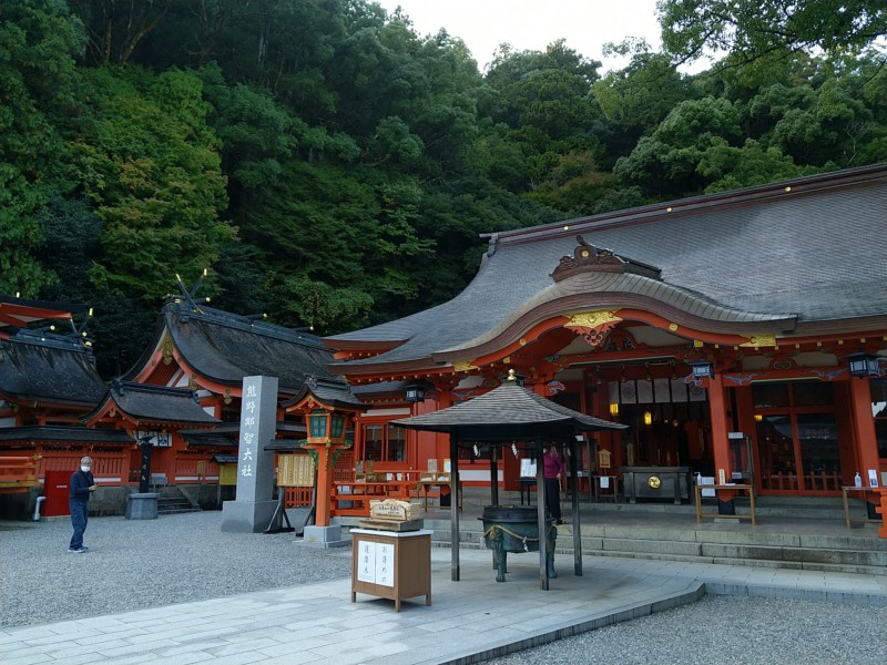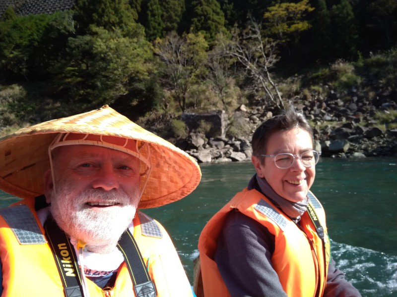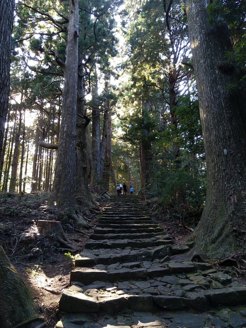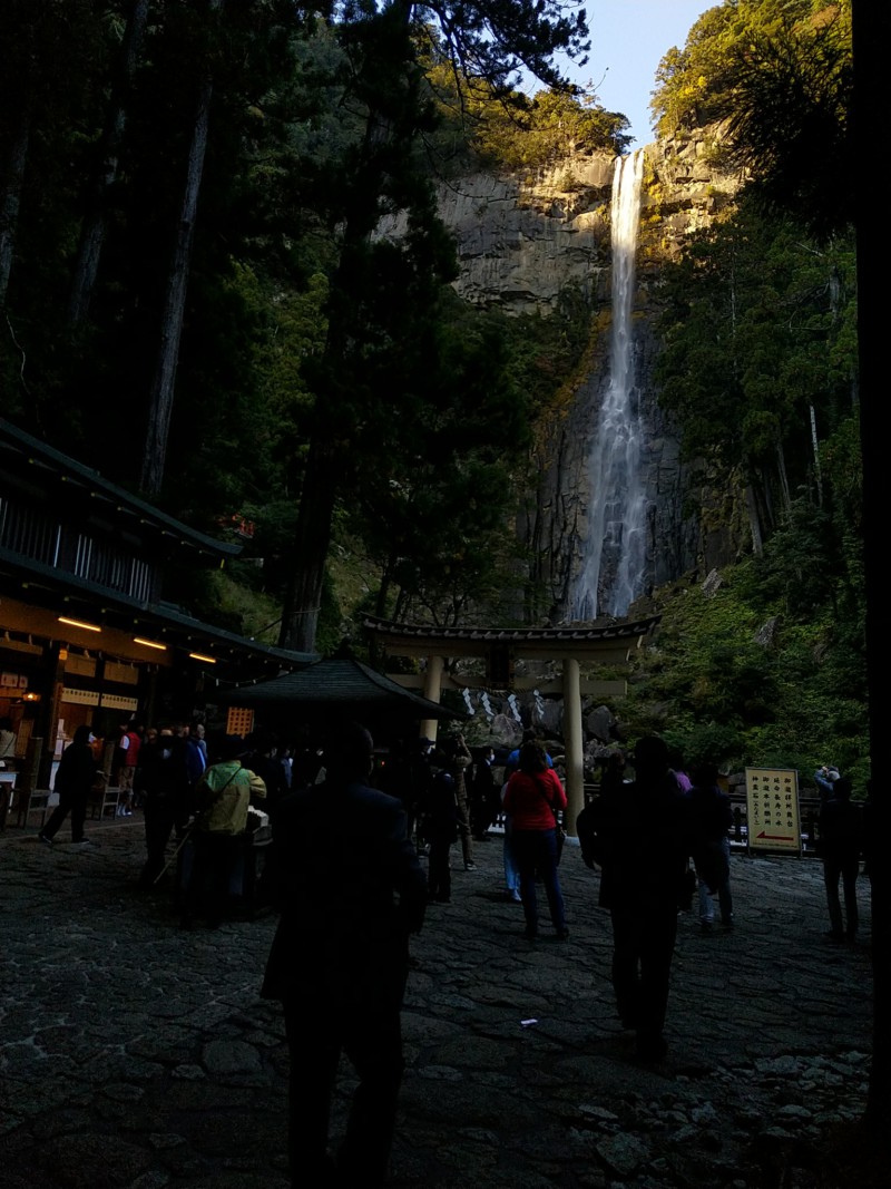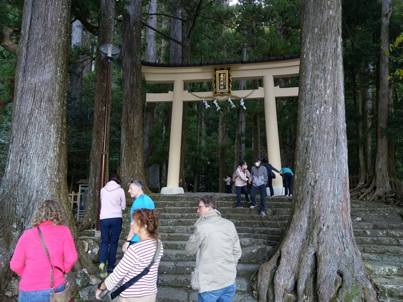 Nach dem Mittagessen in der Eingangshalle des Supermarkts bringt uns der Bus zu einem weiteren Schrein - den Nashi-Schrein. Diesmal müssen wir uns den Zugang hart erarbeiten. Zuerst holprige, unegale Stufen durch einen wunderschönen Wald mit riesigen Bäumen. Darauf folgen 468 (Elke hat mitgezählt) mehr oder weniger gleichmäßige Stufen. Es lohnt sich, denn der Blick über eine Pagode auf den Wasserfall ist schon beeindruckend. Etwas weiter unten können wir dann auch noch auf den Nashi-Wasserfall direkt schauen.