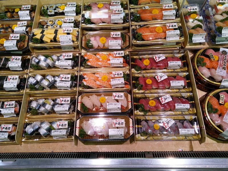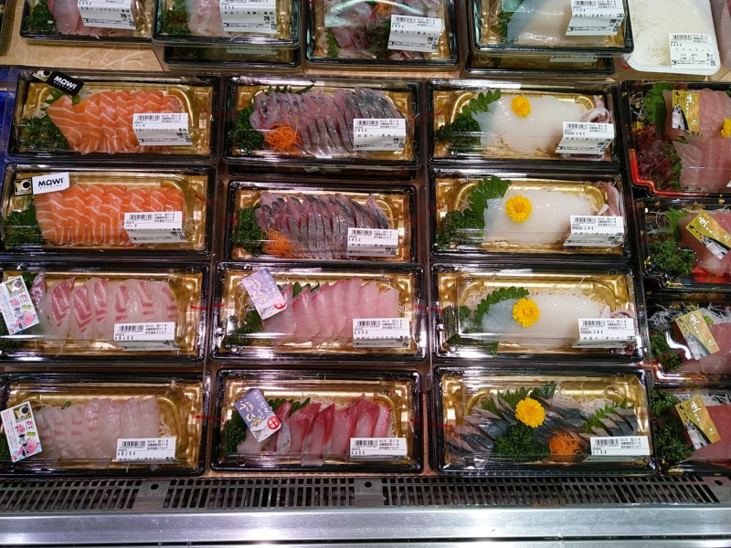 Danach laufen wir zu einem Schrein, sehen ihn uns an und steigen wieder in den Bus. Gegen Mittag halten wir an einem riesigen Supermarkt und kaufen uns was zum Essen. Die Sushi-Auswahl oder Rohfischabteilung ist gigantisch. Wow. So einen Markt hätten wir gerne zu Hause. Während ich einen Café besorge versucht Elke zu bezahlen und bringt eine Kassiererin fast zum Weinen, weil der Strichcode nicht gelesen werden kann. Die nehmen hier sowas sehr persönlich!