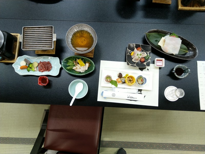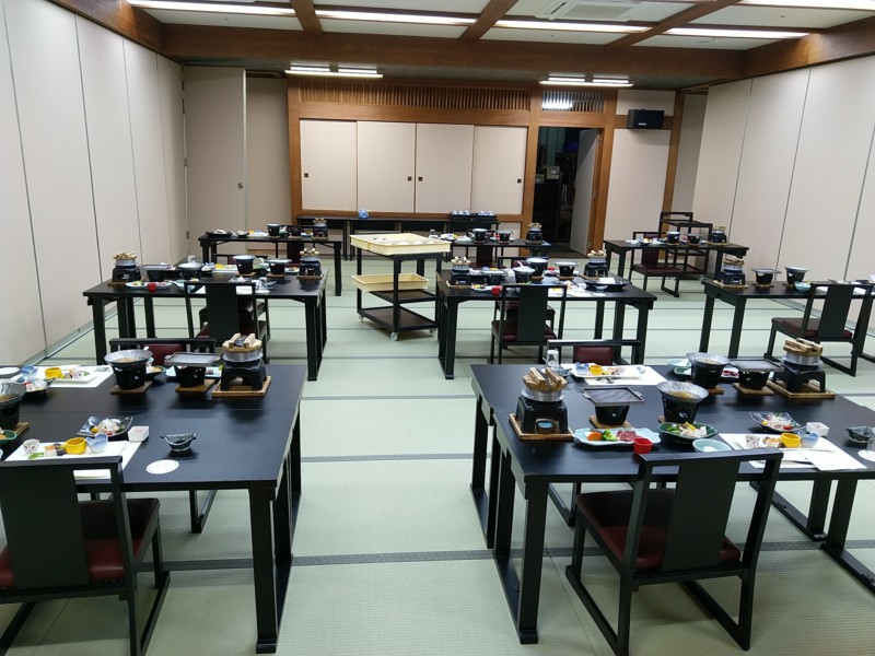 Im 2.Stock gibt es mehrere "Separees" zum dinieren. Die Atmosphäre (siehe Bild) ist ähnlich heimelig wie in einer Turnhalle. Die "Einzelabteile" sind durch variable Trennwände konfigurierbar. Die Tische sind mit unzähligen Tellerchen und Töpfchen vorbereitet. Keishi erklärt uns die einzelnen Teller; wir wüssten sonst nicht was es wäre. Das muss man den Japanern lassen - es ist selten das was es scheint zu sein. Es ist sehr schmackhaft, aber wie immer viel zu viel. Während er die Route für den nächsten Tag erklärt plärrt der Lautsprecher in unserer Zelle die Grußworte aus der Nachbarzelle. Ein Erlebnis ist es immer wieder.