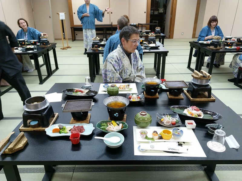 Keishi bat uns beim Abendessen im Kimono anzutreten - fürs Gruppenbild. Machen wir! Ich hoffe wir bekommen das Bild irgendwie.