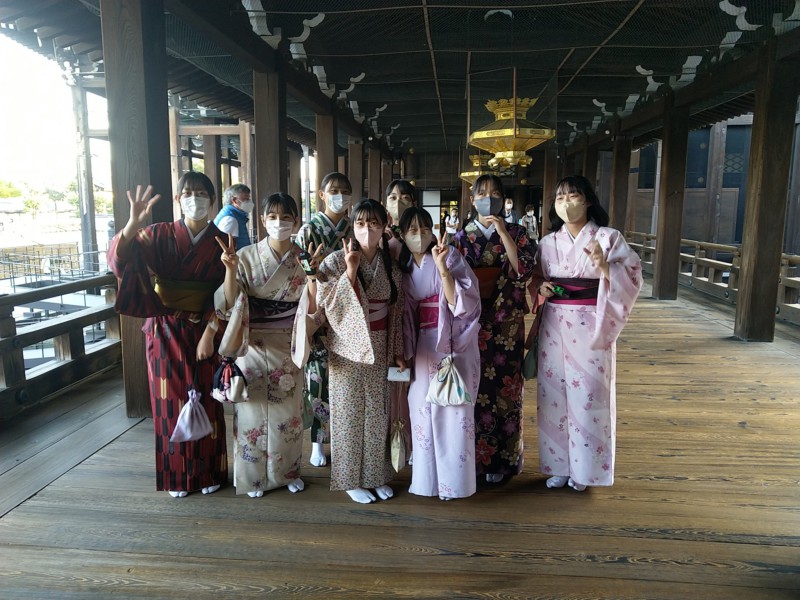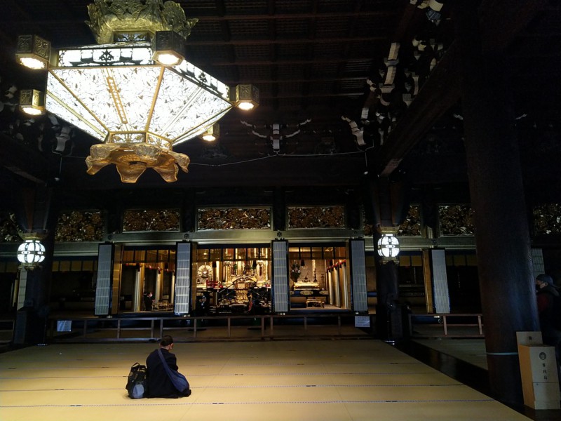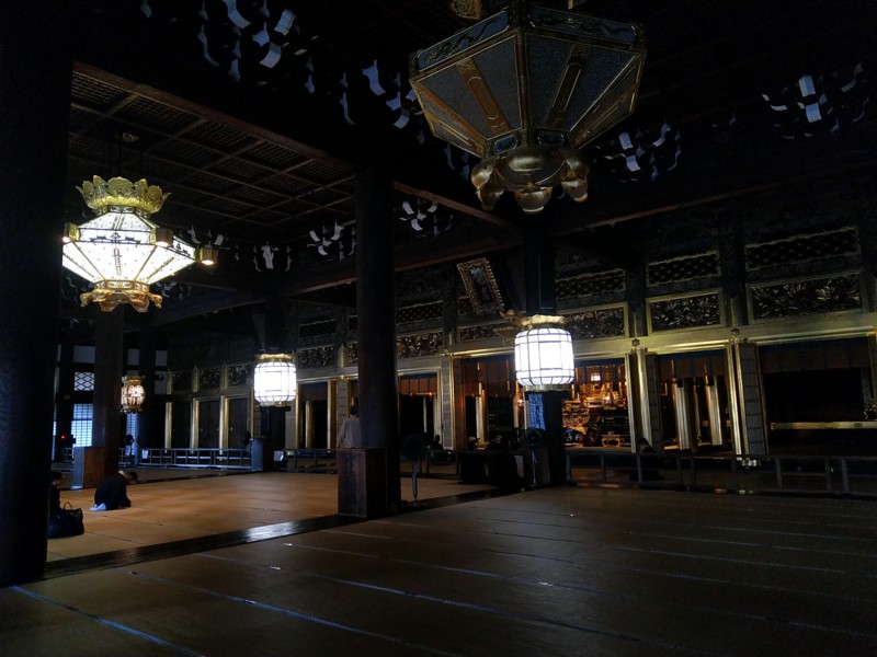 Zuguterletzt besuchen wir noch den Nishi Honganji Schrein. Der ist schon sehenswert, aber noch interessanter sind die vielen jungen Frauen im Kimono. Und - sie wollen fotografiert werden!!!! Auch mit uns! Etwas mehr Licht, es ist schon weit nach 4, und es wäre perfekt. Aber auch so haben beide Seiten ihren Spaß und das ist die Hauptsache.