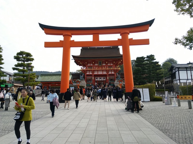 Wir steigen in mehrere Taxis und fahren zum Bahnhof. Dort steigen wir in den Zug zum Shinto-Schrein Fushimi Inari Taisha - dem Fuchsschrein. Holla. Sehr viele Touristengruppen und Schulklassen gleichzeitig wollen sich diese heilige Stätte ansehen. Das besondere hier sind die vielen orangefarbenen Tore, von Privatpersonen gestiftet, die einen regelrechten Tunnel bilden. Das ist schon sehr beeindruckend. Zum Ende unserer Zeit dort kommt sogar die Sonne raus.