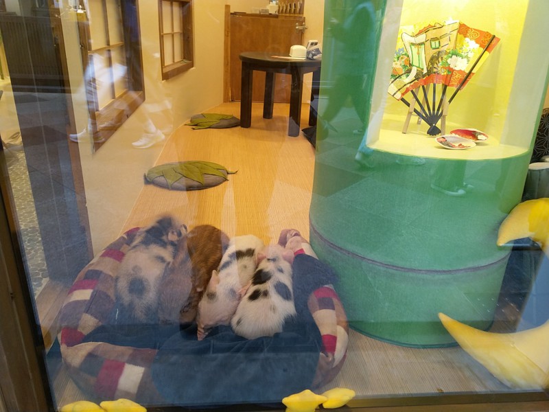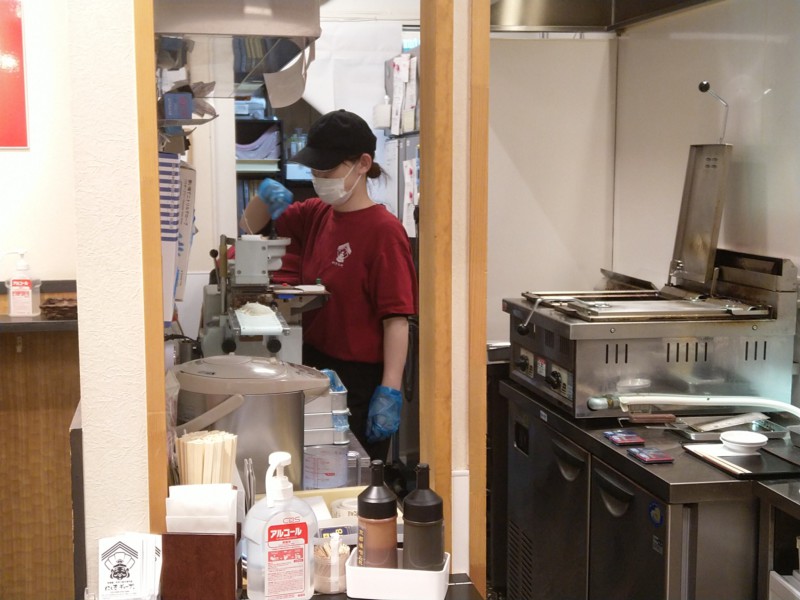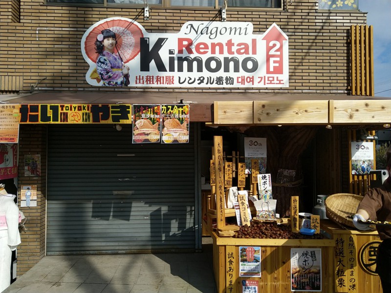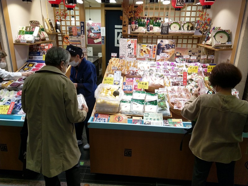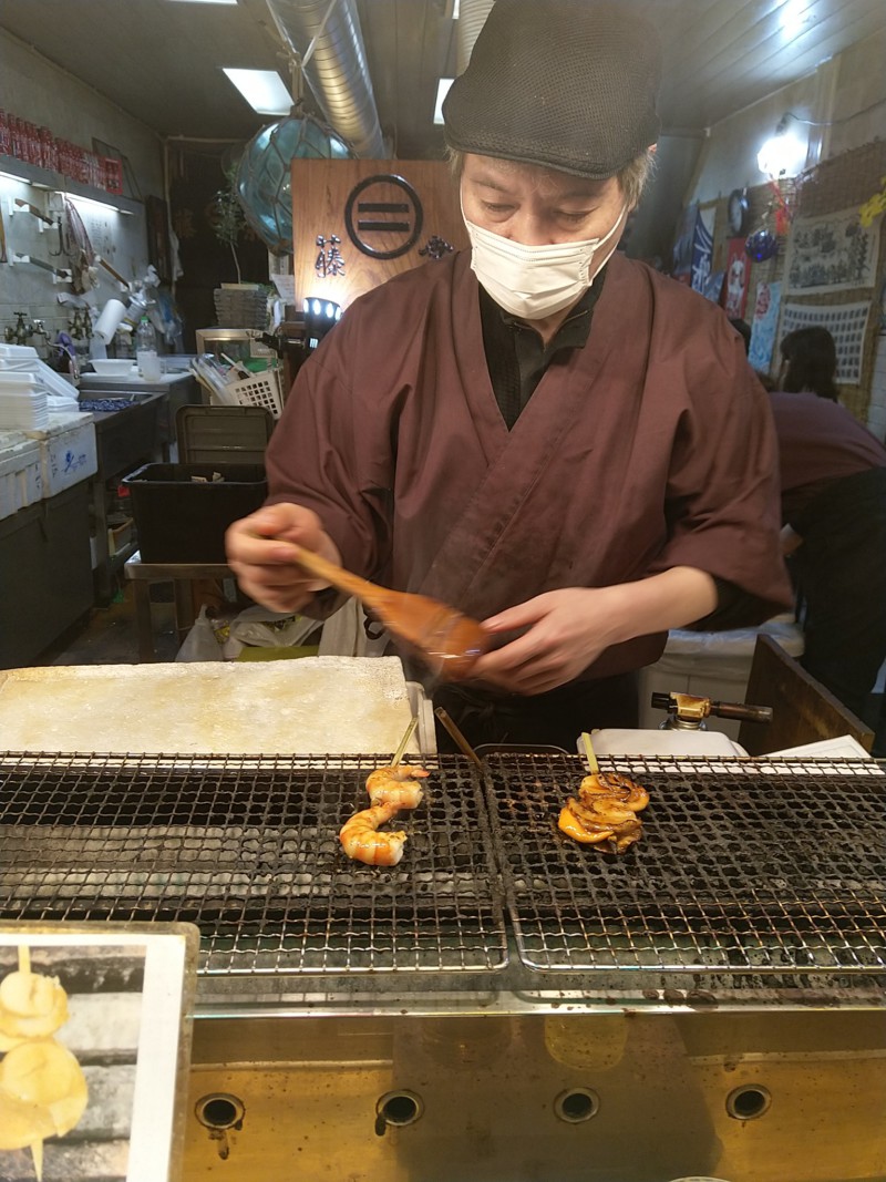 Weiter geht es mit dem Taxi zum Nishikii-Markt, DER Einkaufsmeile für Touristen. Es gibt aber auch schöne kleine Restaurants. Und genau deshalb machen wir hier Mittagspause. Elke und ich suchen erstmal einen Kaffee. Starbucks ist hier leider führend. Danach schlendern wir mit allen anderen Touristen durch die enge Gassen. Zuerst hohlen wir uns 2 Garnelen am Spieß, dann 2 Riesenreiswaffeln und zum Abschluss gefüllte Teigtaschen die vor Ort in einer Maschine gefertigt werden.