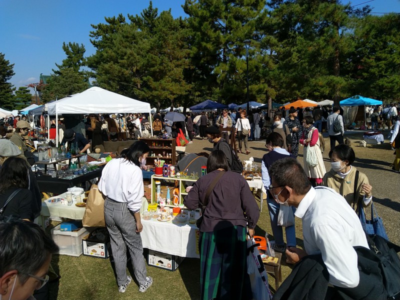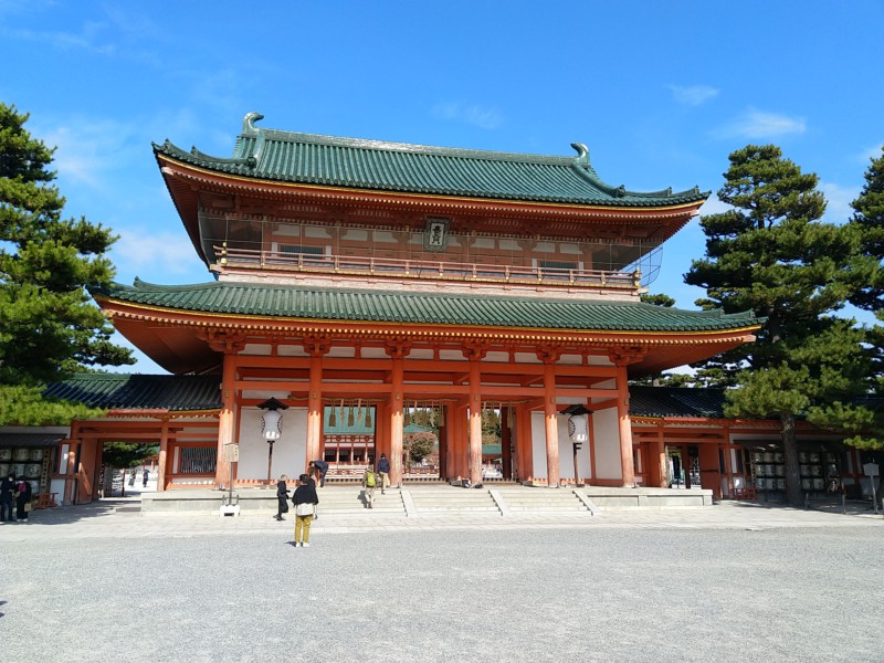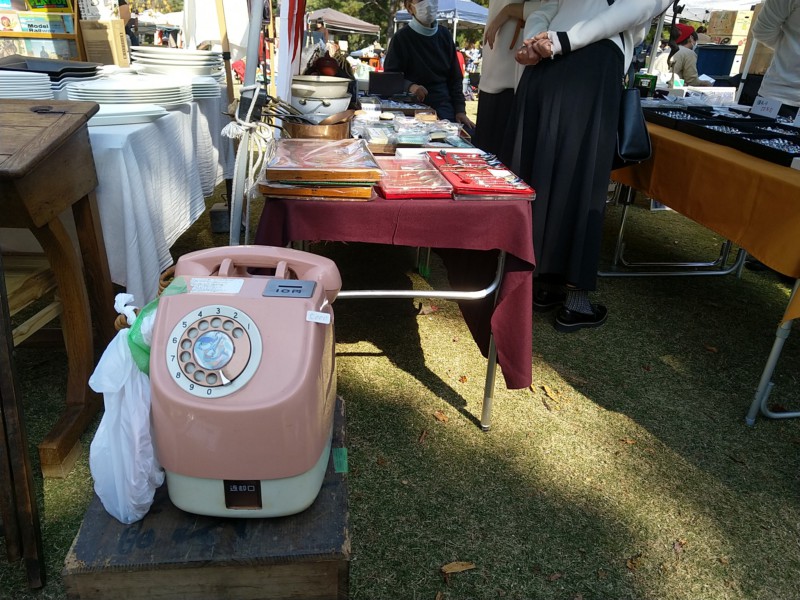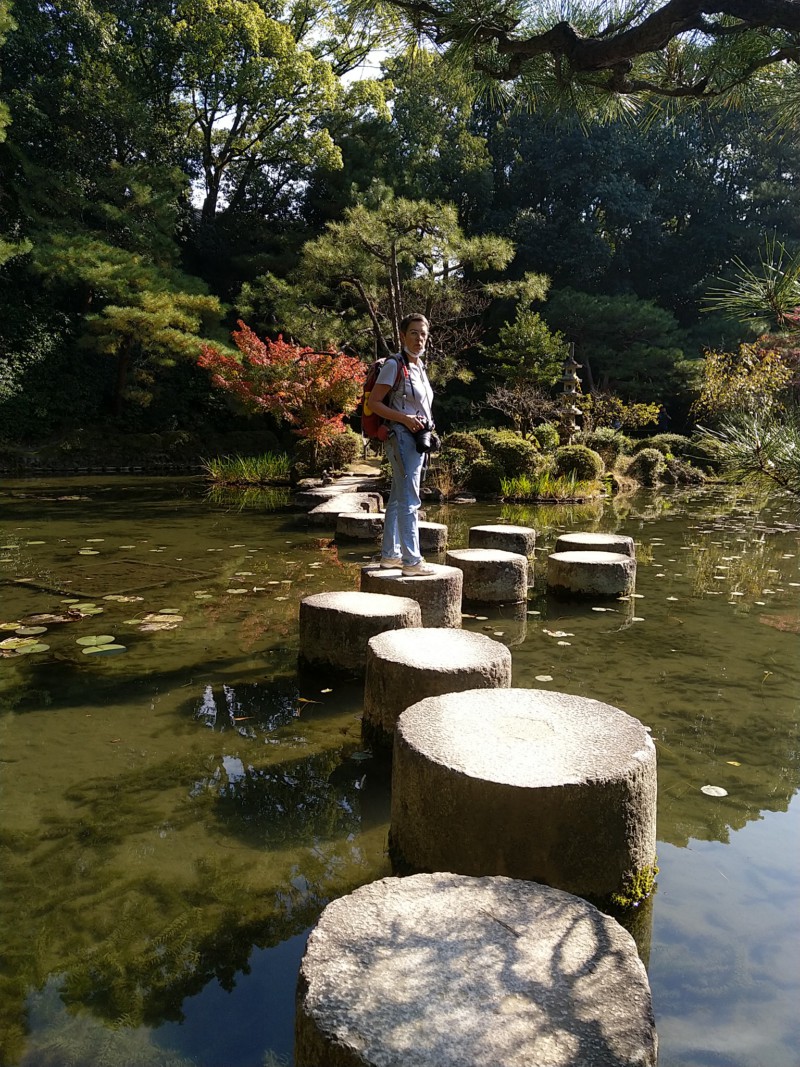 Wir steigen wieder in einen Zug und fahren zur nächsten Attraktion. In der U-/S-Bahn verteilt Keishi Bonbons und wird von einer alten Dame zurechtgewiesen, dass Essen und Trinken in der Bahn verboten sind. Am Zielbahnhof ist es ein Stück zu laufen zum Shinto-Schrein, Heian-jingu, der für seinen besonders schönen Garten berühmt ist. Teile des Films "Lost in Translation" sind hier gedreht. Der Garten ist aber auch wirklich schön. Zufällig ist gegenüber heute ein Flohmarkt und wir bekommen nochmal 20 Minuten Freizeit 😃. Ein rosa Münztelefon und ein altes Radio in einer Apfelsinenkiste haben in es mir angetan. Nur der Platz im Koffer hindert mich sie zu kaufen 😒. OK - Elke auch!