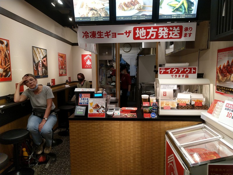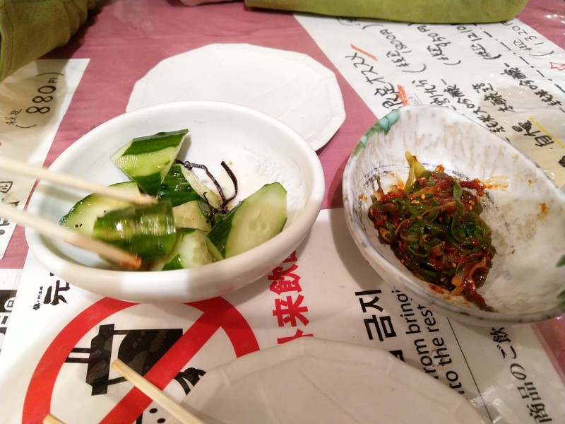Danach trennen Elke und ich uns von der Gruppe. Wir môchten gerne noch selbst etwas herumstromern. Wir werfen im nahegelegenen Hotel Ballast ab und ziehen alleine, mäandernd durch die Gassen, los. Wir finden das immer total spannend sich einfach so treiben zu lassen. Schwierig wird es wieder Mal bei der Essenssuche. Lokale die uns gefallen haben nur eine japanische Karte - ohne Bilder. Das ist echt schade, da selbst hier Englisch nicht vorausgesetzt werden kann. Wir landen in einem kleinen Lokal in dem man viele Kleinigkeiten per Bild (englische Übersetzung inbegriffen) bestellen kann. Es gibt Gurke in einer leckeren Soße, Lauchkimchi schön scharf, Krabbenchips (die wollte ich unbedingt probieren), nochmals die Teigtaschen von heute Mittag, gegrillten Lachs und noch Soya frittiert. Super, so muss es sein! Außerdem ist kein Touri zu sehen!