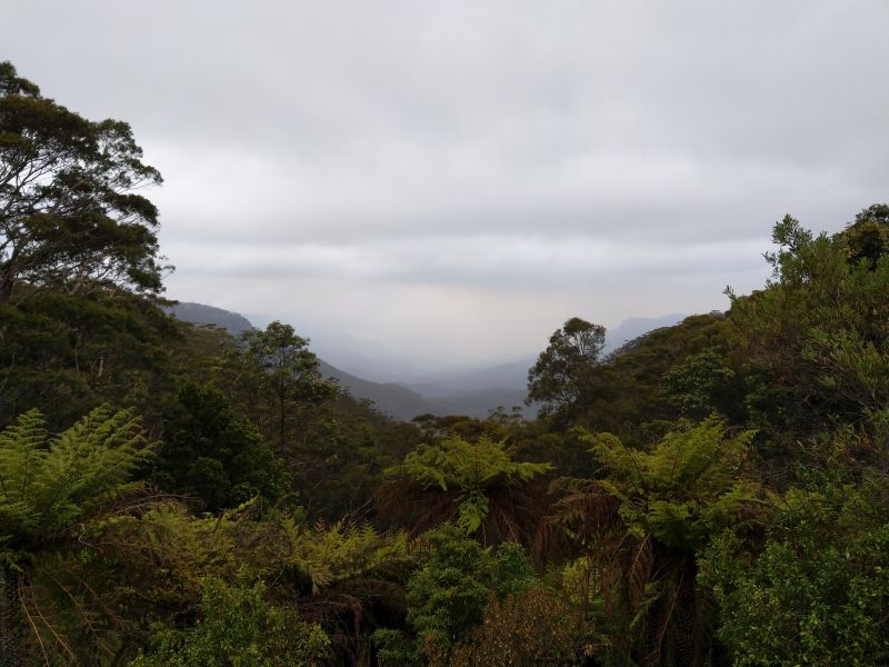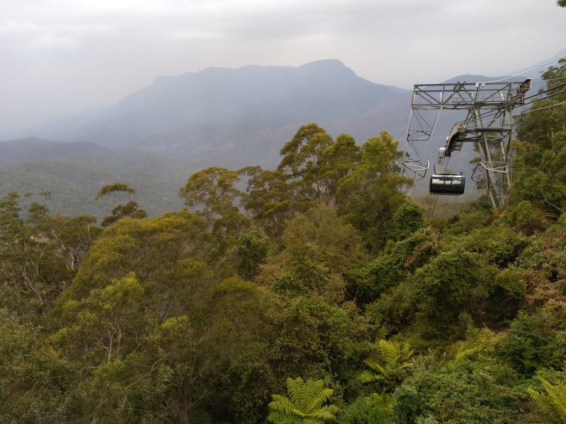 Auf dem Weg zum Campingplatz versuchen wir noch einen offenen Track zu finden - aussichtlos. Unweit des Platzes ist die \"Scenic World\". Mit 3erlei Seilbahnen kann man über einen Canyon, unter dem Blätterdach des Waldes und, nach einem Spaziergang in der Schlucht wieder hinauf. Das Ganze macht eigentlich nur Sinn wenn man etwas Sicht hat und die hat man gerade nicht. Wir lassen das also und machen uns einen Tee vorm Camper.