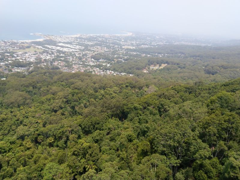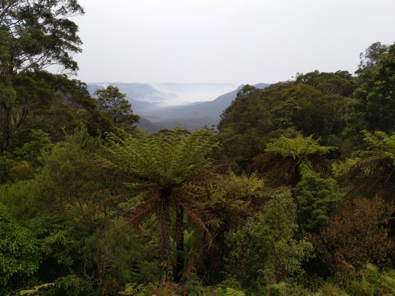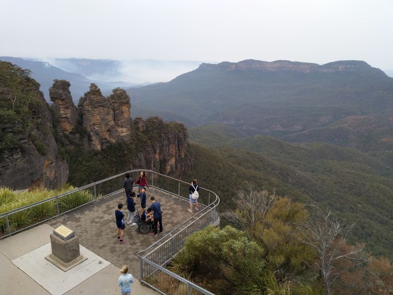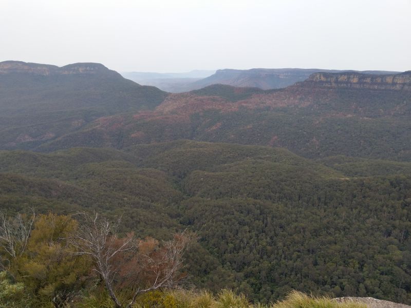 Es ist auch etwas wärmer. Wir fahren los und kommen an einem Lookout vorbei und siehe da: man kann recht gut auf die Blue Mountains schauen. Unten im Tal liegt dicker Nebel oder Rauch. Wir telefonieren kurz mit Susi, die schon wieder in Sydney ist, und sie meint, dass es Rauch sei. In der Nacht haben Sie und ihr Trupp nämlich Gegenfeuer kontrolliert.