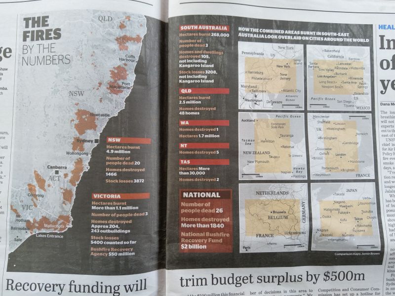 Die Frau erzählt uns noch, dass man südlich von hier die verbrannten Kängurus riecht. Es ist furchtbar. Wir bekommen später noch eine Zeitung in die Hand in der man Fotos sieht von aufgehäuften Kängurukadavern.