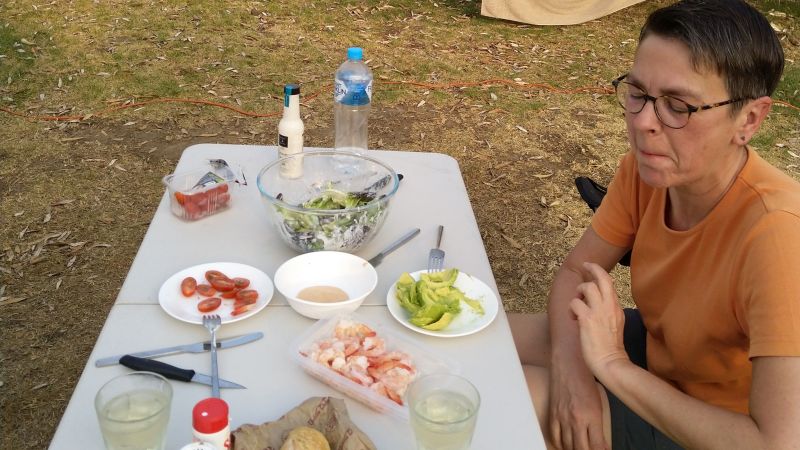 Wir machen einen langen Strandspaziergang bei mittlerweile wieder 30°, es wird wolkiger und nieselt ganz leicht. Zum Abendessen gibt es Salat, Garnelen, Avocado für mich und Tomaten für Thomas. Vielleicht mal vor dem Camper ohne Rauch, kalt, Asche oder brüllende Hitze? Einfach mal so ein ganz normales Camping-Dasein?