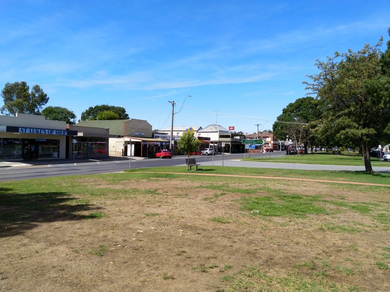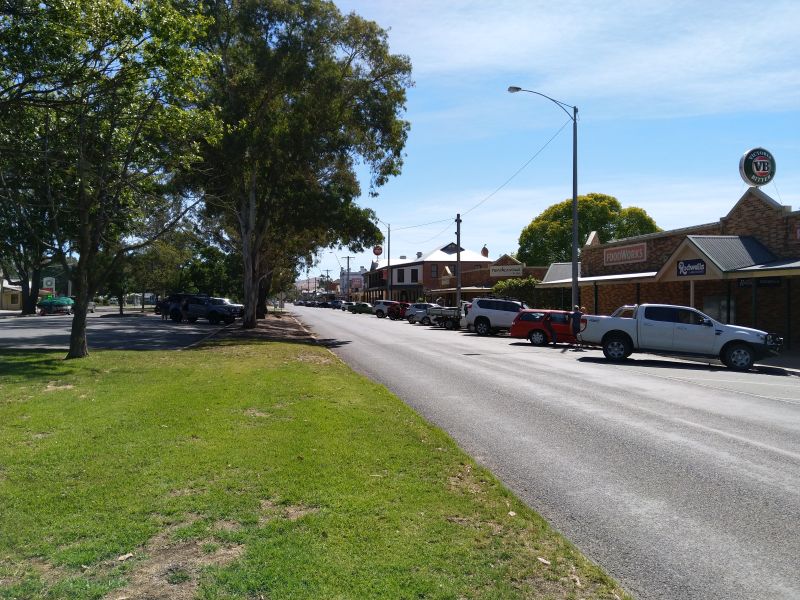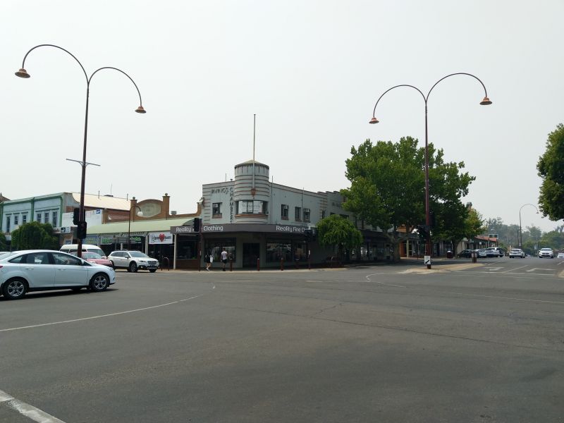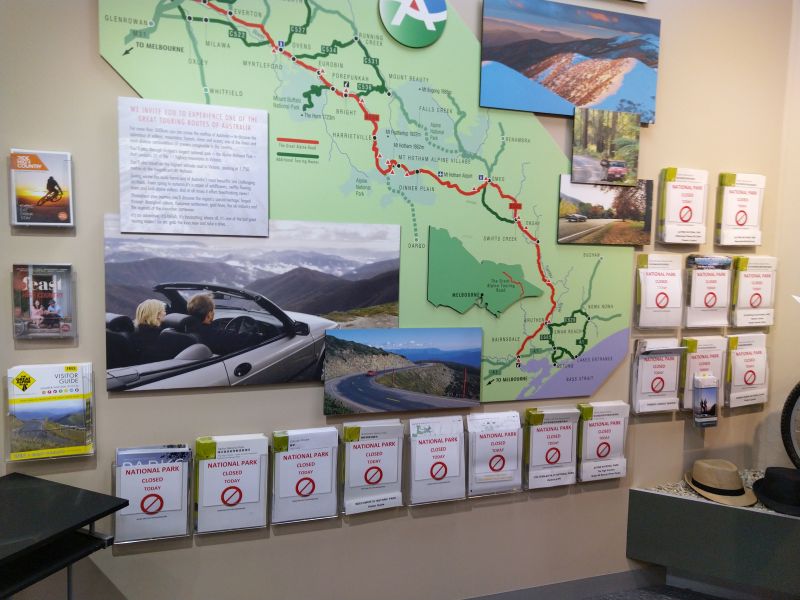 Wangaratta. Dort schauen wir in der Touriinfo vorbei wo uns eine nette und hilfsbereite Mitarbeiterin versorgt. Auf einem riesigen Whiteboard können wir zum ersten Mal die Strassenkarte und die Feuerkarte anständig ansehen. Auf dem Daumenkino vom Handy ist das nicht so überschaubar. Auf einer Übersicht sehen wir sehr schön welche Nationalparks in der Umgebung geschlossen sind - alle! Mit allerlei Material und Info bepackt entscheiden wir uns weiter zu fahren.