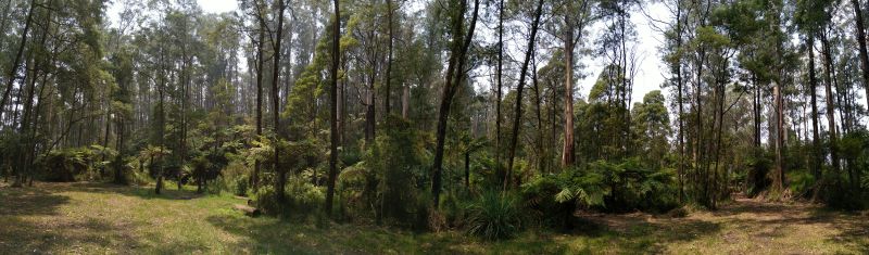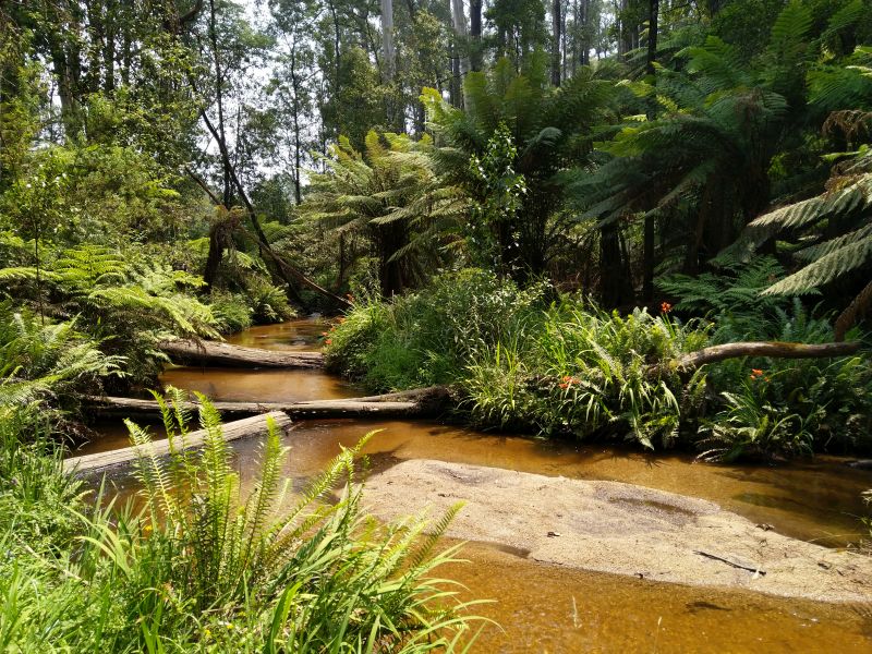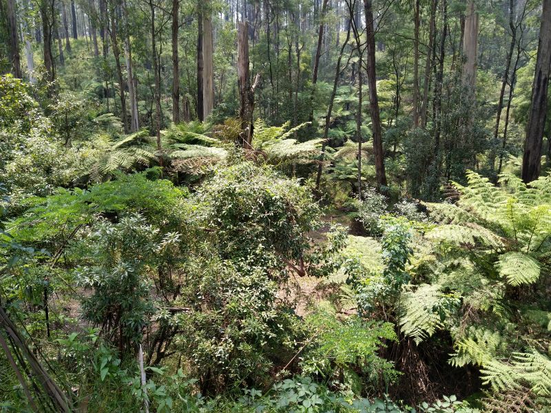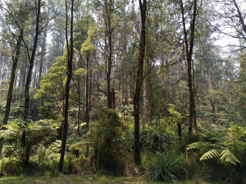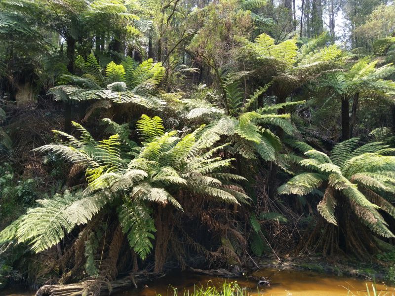 Eigentlich ist das alles nicht mehr zu toppen. Mittlerweile fahren wir sogar durch grünen Wald und an grünen Wiesen entlang. In Powelltown, einer Ansammlung weniger Häuser, halten wir an einem Picnicplatz, weil wir aus dem Staunen nicht rauskommen. Kurz vorher sind wir durch Regenwald gefahren, aber hier ist es einfach umwerfend. Viele alte Bäume und Baumfarne an einem Bach - traumhaft. So wird Australien aussehen, wenn es nicht gerade abbrennt!