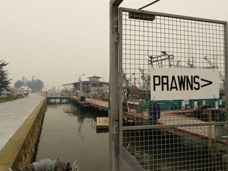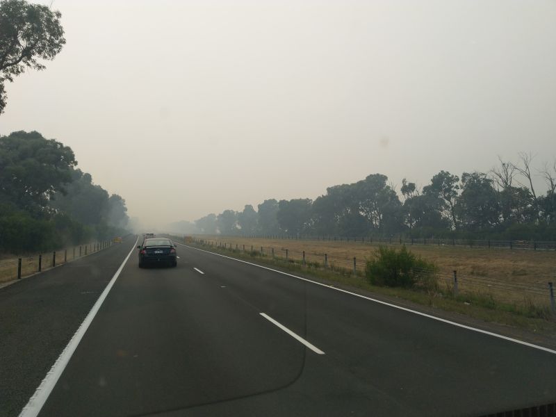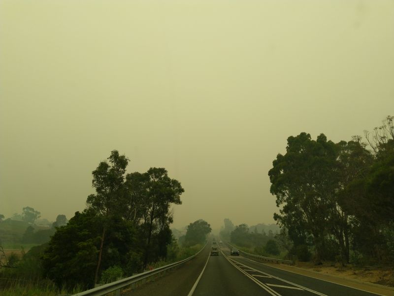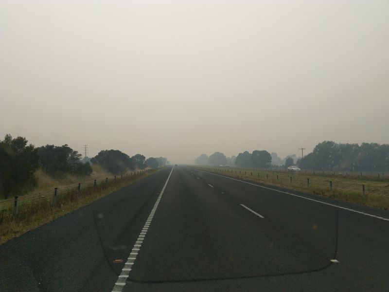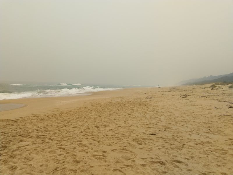 Wir fahren los Richtung Südosten und es wird leider immer rauchiger und die Sicht tendiert gegen Null. In Bairnsdale gibt es den obligatorischen Kaffee des Tages und es ist fast unerträglich. Die Luft ist gelb, die Augen brennen ein bißchen und der Hals ist kratzig. Susi hatte uns gestern noch erzählt, dass der Rauch schon an der Westküste angekommen sei. Also etwa 4000km weiter weg. Wir hoffen eigentlich dass es an der Küste in Lakes Entrance besser ist, müssen dann aber feststellen, dass es hier noch schlimmer ist. So können wir das nicht aushalten, eigentlich wollen wir 3 Tage hier bleiben und den Ninety Mile Beach erwandern. Eigentlich ist Lakes Entrance DAS Touristeneldorado, es gibt ein Motel,Campingplatz neben dem anderen. Und normalerweise würde man hier keinen Platz im Café oder am Strand bekommen. Jetzt: tote Hose, vereinzelt sind ein paar Menschen unterwegs, sogar der Strand ist gesperrt weil die Lifeguards nichts sehen würden. Es ist echt traurig.