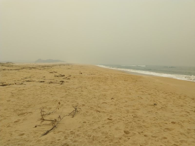Wir fahren ein paar Kilometer nach Lake Tyers zu unserem Campingplatz, wo es zu normalen Zeiten wesentlich ruhiger zugeht und tatsächlich die Luft etwas besser ist. Vom Platz kann man zu einem wunderschönen leeren Strand gehen und tatsächlich sehen wir den Horizont!