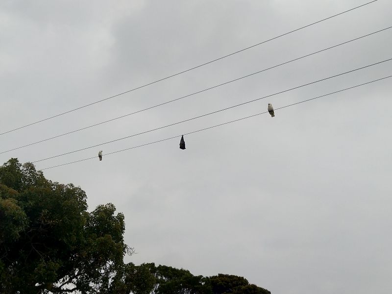 Wir laufen die Esplanade rauf und runter um Postkarten zu kaufen. Kein leichtes Unterfangen. Mittlerweile sind wenigstens einige Leute unterwegs. Touris sind es aber, glaube ich, nicht. Auf der Rückfahrt entdecke ich einen riesigen Flughund, der an der Stromleitung abhängt.