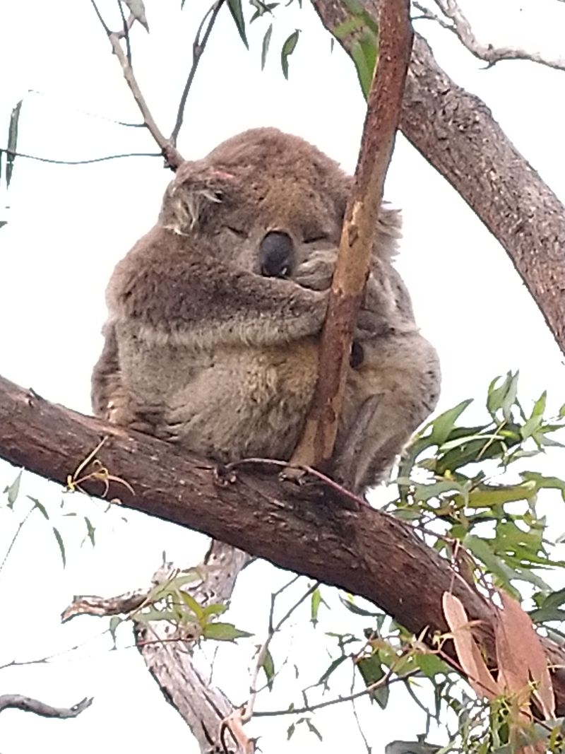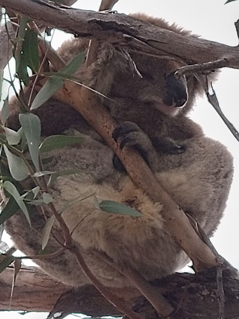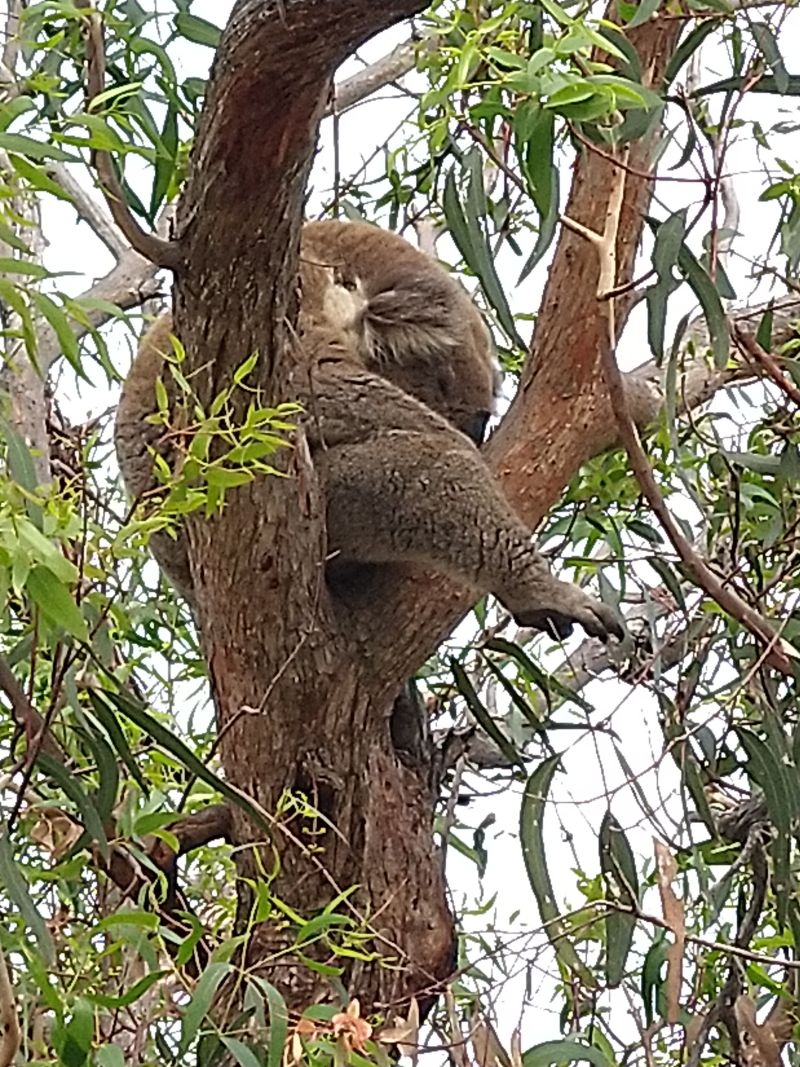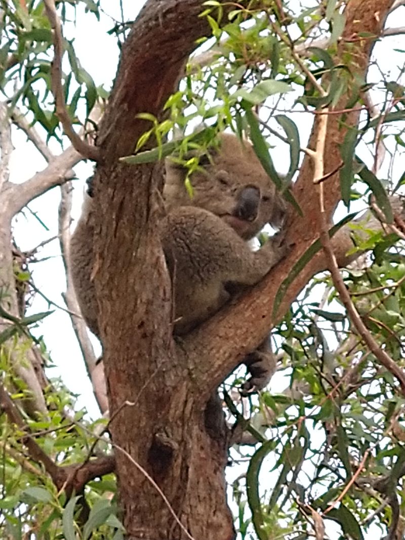 Koala in einer Astgabel rumlungern. Ob er gerade schläft oder nicht ist nicht auszumachen. Wir sind begeistert, aber es kommt noch viel besser. Nach etwa einer Stunde haben wir bestimmt 15 Koalabärchen gesehen; manche nur wenige Meter entfernt. Einfach klasse, die haben so süße, flauschige Ohren, dass frau sie gerne mal streicheln würde. Vollkommen aufgedreht gönnen wir uns nach einer weiteren Überfahrt einen Café an der Waterfront und schauen uns unsere Bilder an.