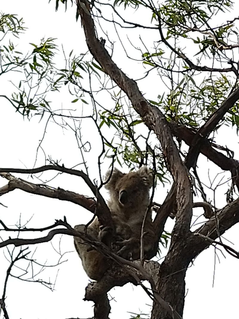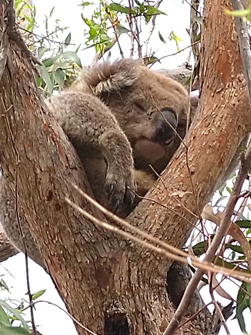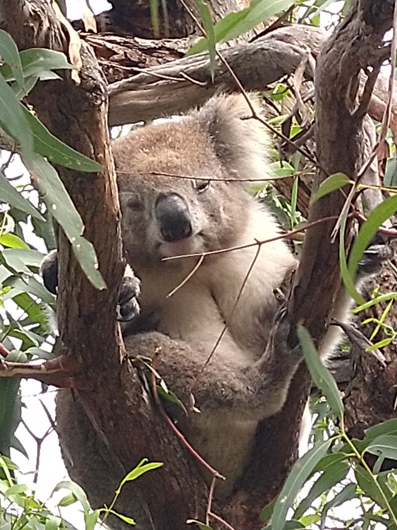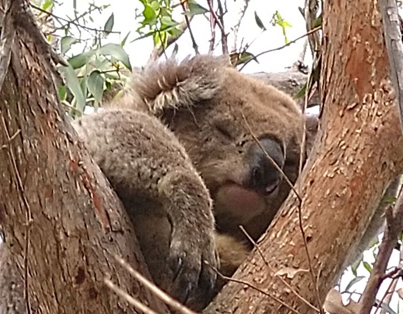 Koala in einer Astgabel rumlungern. Ob er gerade schläft oder nicht ist nicht auszumachen. Wir sind begeistert, aber es kommt noch viel besser. Nach etwa einer Stunde haben wir bestimmt 15 Koalabärchen gesehen; manche nur wenige Meter entfernt. Einfach klasse, die haben so süße, flauschige Ohren, dass frau sie gerne mal streicheln würde. Vollkommen aufgedreht gönnen wir uns nach einer weiteren Überfahrt einen Café an der Waterfront und schauen uns unsere Bilder an.