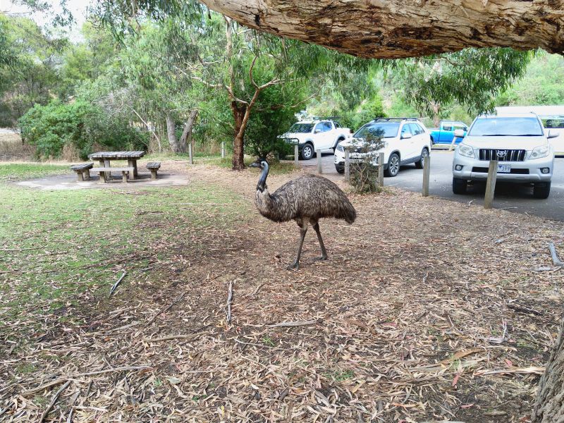 Wieder am Visitorcenter schauen Alle einen Baum hoch. Da sitzt in luftiger Höhe ein weiterer Koala. Außerdem streunen noch 2 Emus durchs Gelände. Besonders scheu wirken die aber nicht :-).