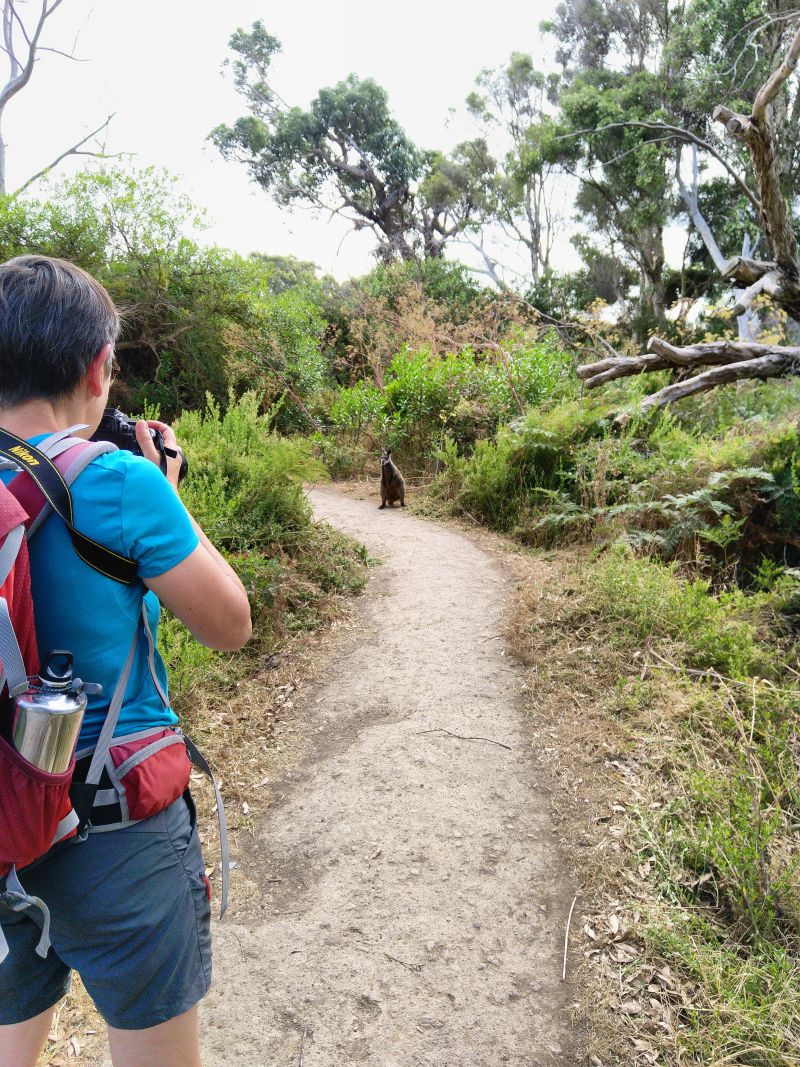 Wallaby vor uns. Alle 3 sind wir erstaunt und regen uns nicht. Das Wallaby ergreift die Initiative und hoppelt keinen Meter von uns entfernt vorbei ins Schilf. Wow! Leider bleibt es bei dem Einen - Schade.