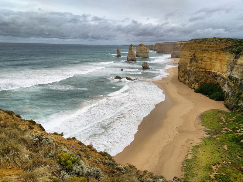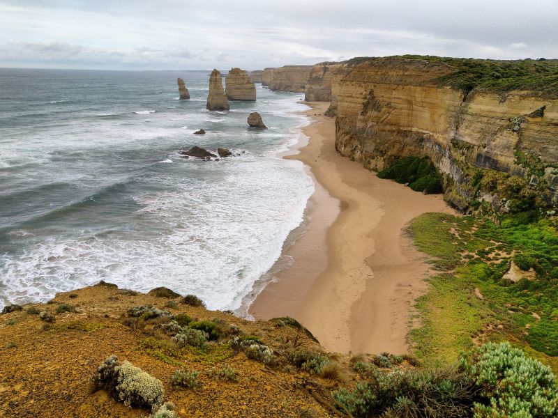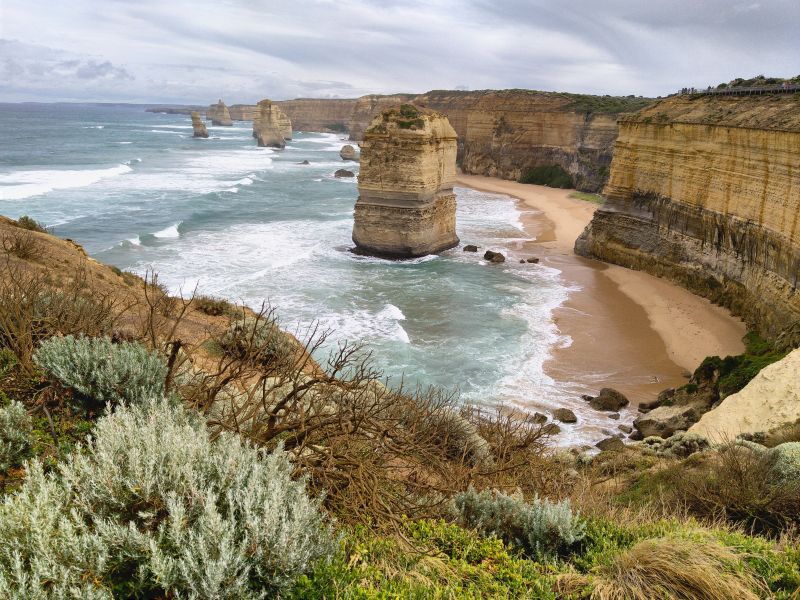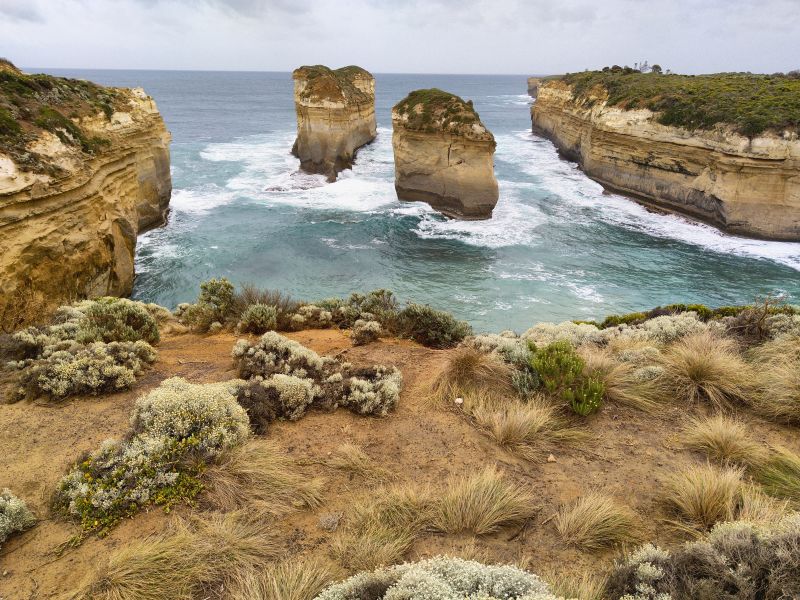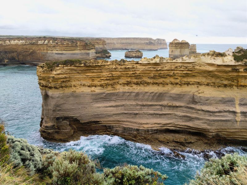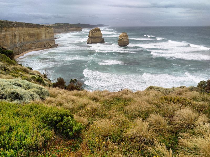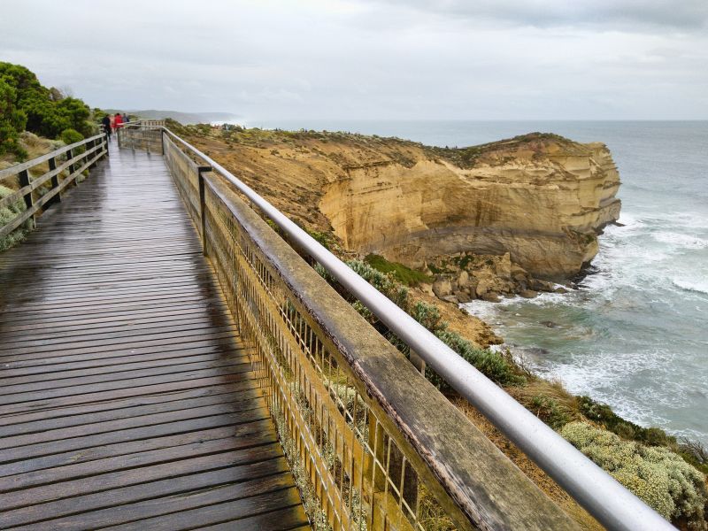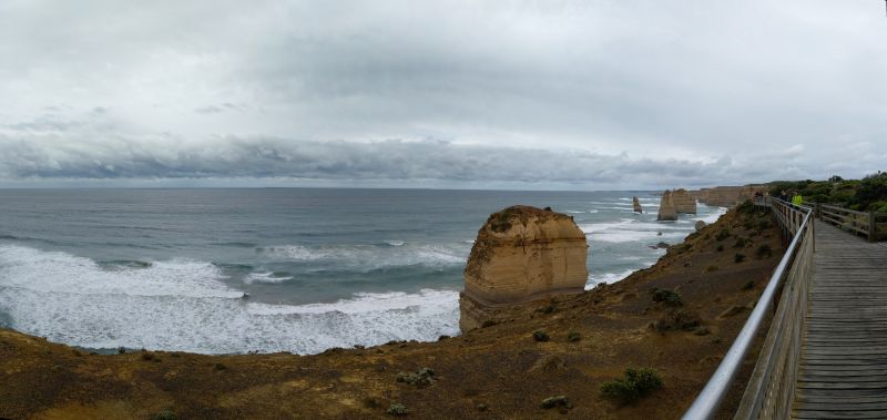 Als wir Richtung Osten losfahren sind es 14°. Da wir die Strecke bis Port Campbell schon kennen fahren wir recht schnell. Am ersten Lookout danach werden wir binnen weniger Minuten ziemlich nass, das ist bei diesen Temperaturen nicht schön.