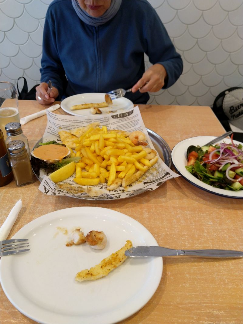 Heute Abend suchen wir uns ein warmes Restaurant im Städtchen :-). wir reissen uns von dem süßen Koala los und fahren zum Abendessen. Im Seafood-Café, eines der wenigen "Restaurants" die abends offen haben, bestellen wir die Seafoodplatter für 2. Weil gegrillt 4$ teurer. Ausser einem Salat und massig Pommes gibt es Tintenfisch, Scallops, Garnelen und Fisch. Alles sehr lecker, aber, wie in einem Take-Away zu erwarten, nicht gerade edel serviert. Hauptsache es schmeckt.
