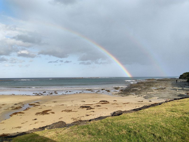 Danach gehen wir am Strand bis zum Hafen und entdecken dort ein Take-Away wo es einen Lobster für 65$ gibt. Wir sind ja 4Tage hier :-). Am Campingplatz zurück, es regnet gerade etwas, gibt es einen tollen Regenbogen über dem Meer. Der Koala hat sich zum Schlafen in seiner Astgabel zusammengerollt.