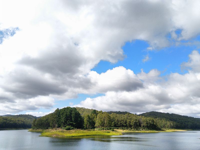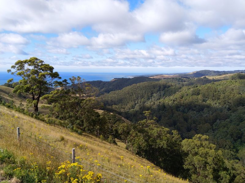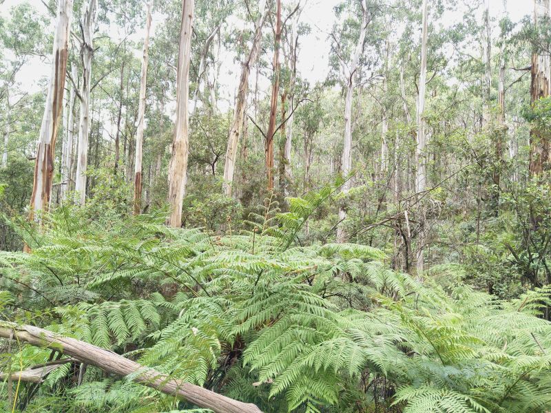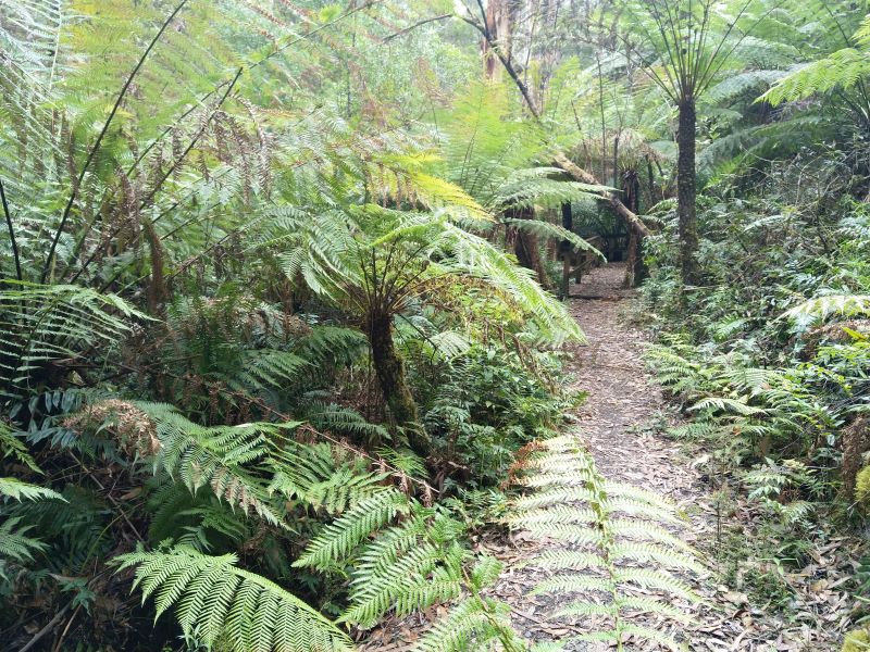 Great Otway NP liegt. Laut Information aus der Touriinfo soll es dort viele Wanderwege geben. Forrest liegt nur etwa 35 km entfernt, aber wir brauchen fast eine Stunde und das liegt nicht an den Fotostopps. Das ist nämlich nur einer. Die Strasse führt durch sehr schönen Wald immer bergauf mit vielen grossen Bäumen und Farnen. Komischerweise gibt es keinerlei Picknick- oder Wanderparkplätze. Am "West Barwon Reservoir" halten wir. Dort sollen viele Wanderwege abgehen. Pustekuchen. Bis auf den "Gully Fern Walk" sind alles MTB-Wege - geschottert. Man kann sich auf nix mehr verlassen. Wir entscheiden uns für einen Schotterweg nach Forrest um dort einen Café zu trinken und dann einen anderen Radweg zurück bis zu dem Fern-Walk, der zum Parkplatz zurück führt.