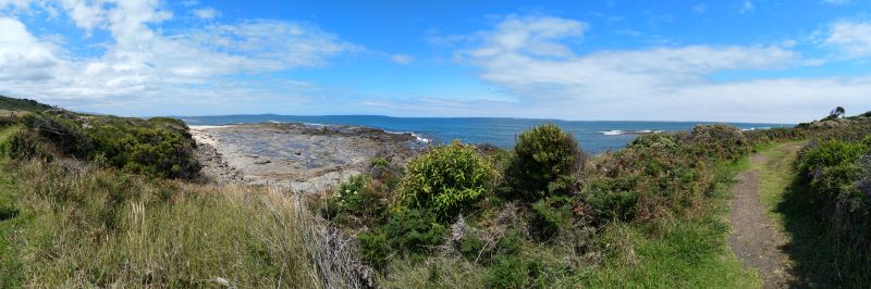 Great Ocean Walk laufen. Der führt nämlich direkt durch den Platz durch. Sehr praktisch. Der Weg führt fast immer direkt am Meer entlang, manchmal sogar am Strand mit der Warnung, dass man nur bei Ebbe dort lang kann. Es gibt unheimlich viele kleine Buchten mit teils tollen Gesteinsformationen. Es sieht aus als würde einiges aus erkalteter Lava bestehen. Müssen wir unbedingt mal nachlesen. Nach 2 Stunden sind wir zurück - es ist fast schon zu heiss. Aus diesem Grund muss ich auch heute ins Wasser. Es ist zwar immer noch kalt, aber lange nicht mehr so wellig. Nach einigen Schwimmzügen fühlt es sich auch nicht mehr so kalt an.
