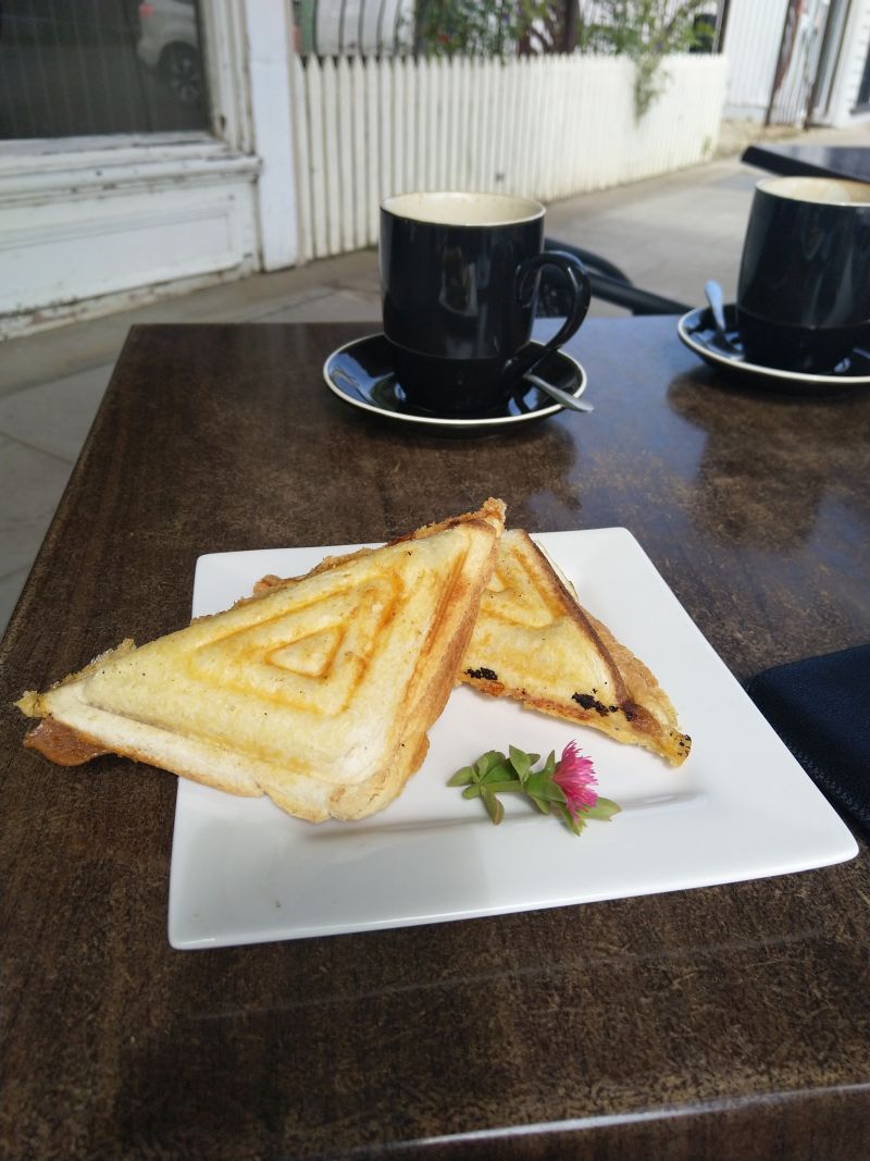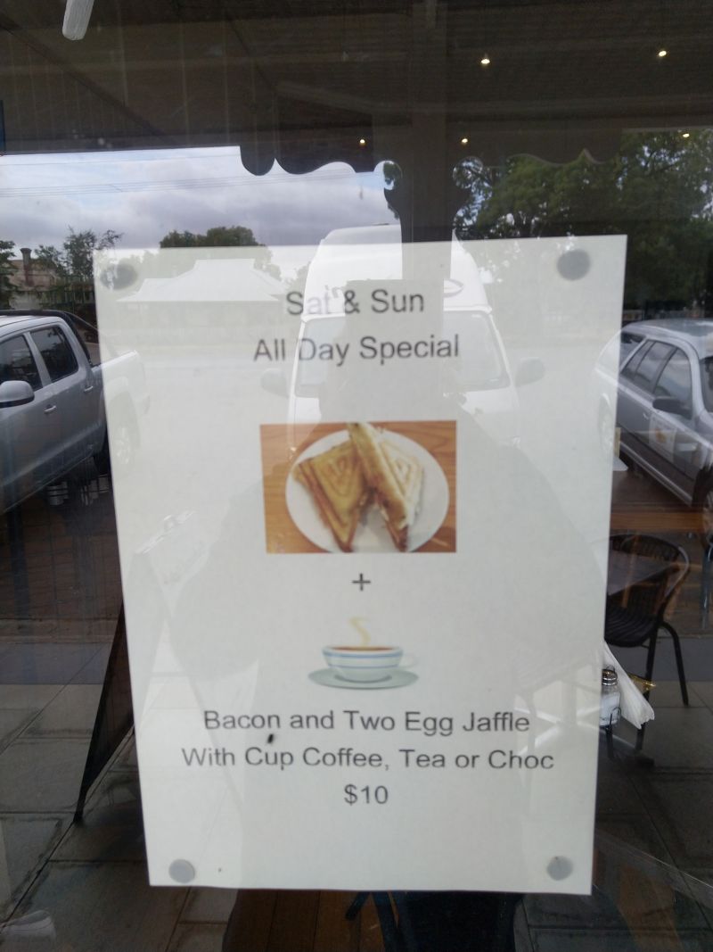 Im Café sehe ich ein "Egg Jaffle"!? Ein nettes älteres Paar steht hinter dem Tresen und spricht mich darauf an, dass ich das Schild mit den Jaffles studiert hätte. Ich frage was das denn sei und erhalte eine wunderbare Beschreibung der Herstellung selbiger Spezialität. Auf ein Toastbrot kommt ein Ei und Speck, Pfeffer und Salz und eine spezielle Soße. Dann wird eine zweite Scheibe Toast darübergelegt und in einem Dreieckseisen zusammengebacken. Das muss ich natürlich probieren. Es schmeckt tatsächlich und ist gleichzeitig mein erstes Toastbrot in Australien. Dazu gibt es 2 Latte. Die Bestellung wird am Tresen sorgfältig analog auf Papier aufgenommen. Der Laden ist geschmackvoll mit normlalen Tischen und auch Sofas ausgestattet, Ausserdem gibt es einen Garten. Wir bezahlen mit Karte, was selbstverständlich ist. Dann fragt uns die ältere Dame ob wir eine Rechnung bräuchten - sie könne selbige uns aufs Handy senden. Uns fällt fast die Kinnlade herunter. Das hat uns noch keiner angeboten. Solltet ihr also mal zufällig in Birreburra sein müsst ihr den Laden aufsuchen. Es gibt auch noch australische Gewürze über die die Dame allerhand zu berichten weiss.