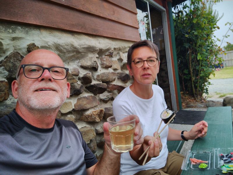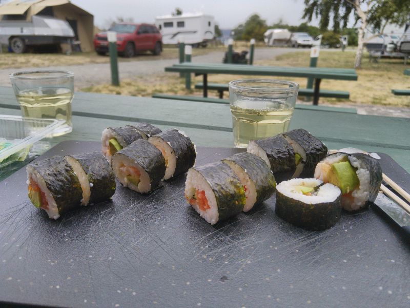 Im COLES wissen wir, dass es oft eine Sushi-Bar gibt. Tatsächlich finden wir sie auf Anhieb und kaufen 6 Röllchen. Super. Leider gibt es keine Essstäbchen mehr. In Snug halte ich beim Chinese-Takeaway und bekomme welche geschenkt. Sehr nett.