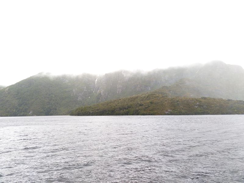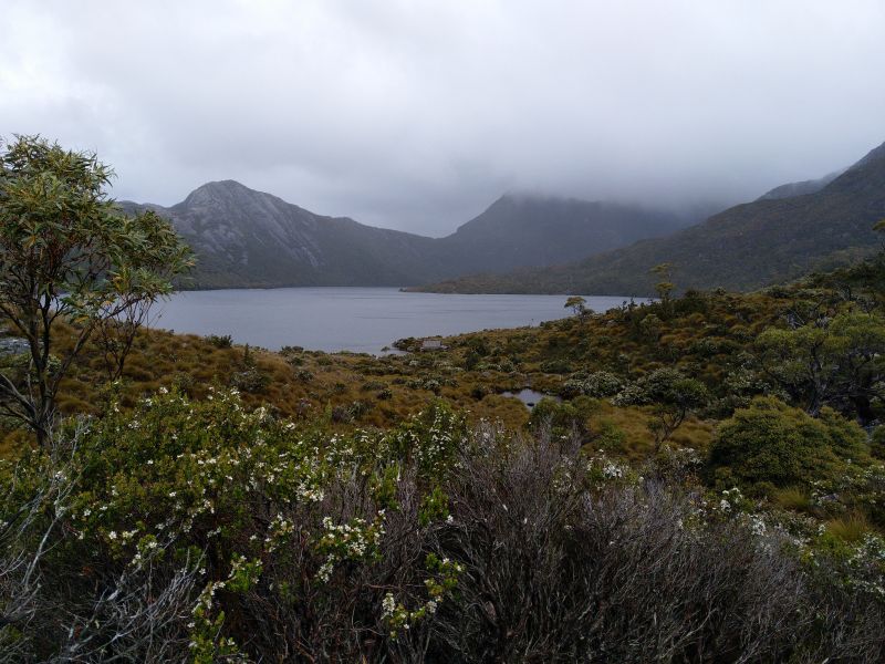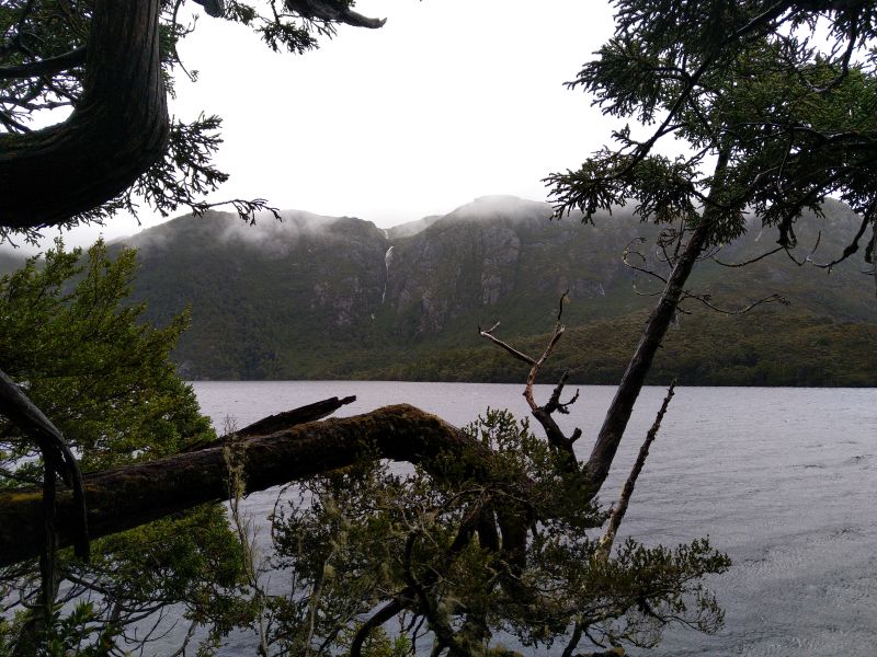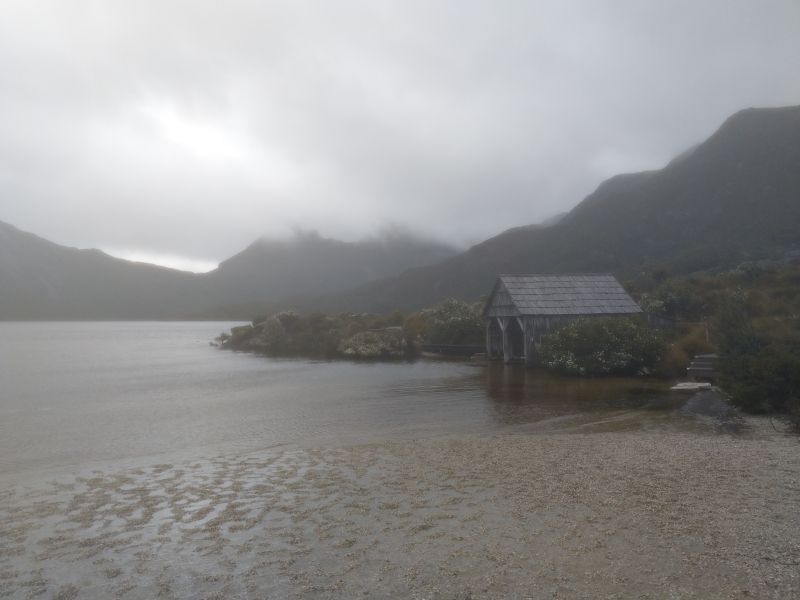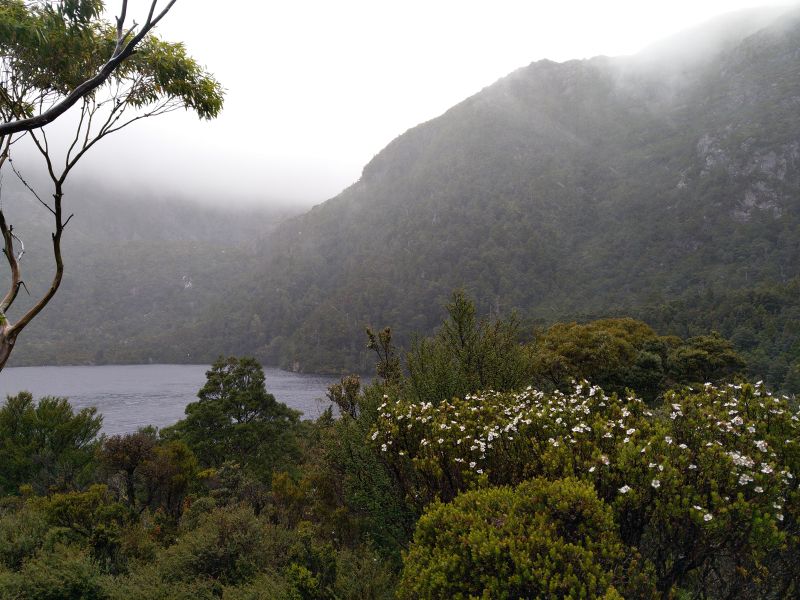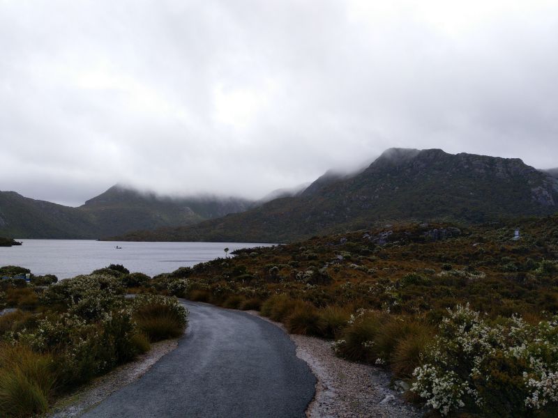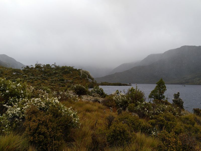 In Tullah gibt es ein Hotel direkt am See, Scones und einen dünnen Café. Die Landschaft ist immer noch grandios, es regnet nicht mehr dauernd und wenige Sekunden kommt die Sonne durch. Am Cradle Mountain Lookout halten wir und hoffen auf ein wenig Fernsicht. Es sind ganze 200m bis dorthin zu laufen. Es zieht wie Hechtsuppe - eiskalt. Der Lookout befindet sich direkt unter einem Hochspannungsmast - sehr schön ausgewählt. Wir schiessen schnell 2 Bilder und verziehen uns in den Bus. Hinter uns zieht die nächste Regenfront heran. Wir schaffen es gerade noch trocken hinein.